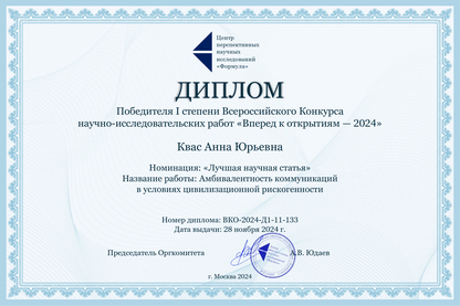 Аспирант 3 курса кафедры теоретической и социальной философии Анна Квас одержала победу во Всероссийском конкурсе научно-исследовательских работ «Вперед к открытиям – 2024», который проходил с 25 октября по 26 ноября в Москве. Молодой ученый была удостоена диплома победителя I степени в номинации «Лучшая научная статья».