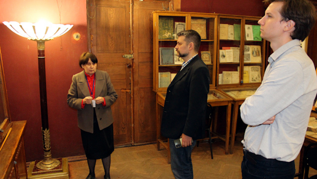 Далее гости библиотеки посетили выставку по истории русской книги, где экскурсию для них провела заведующий сектором отдела С. В. Клеймёнова.