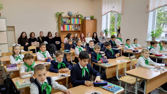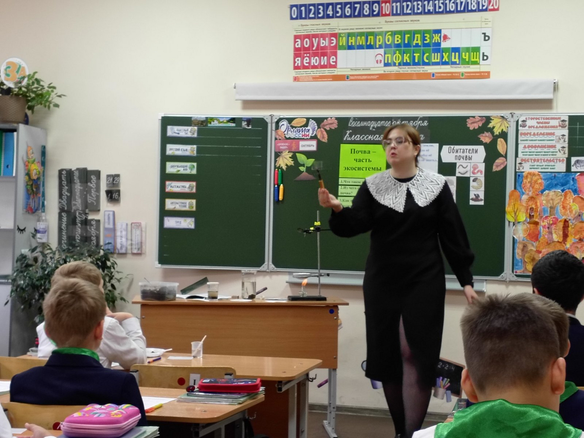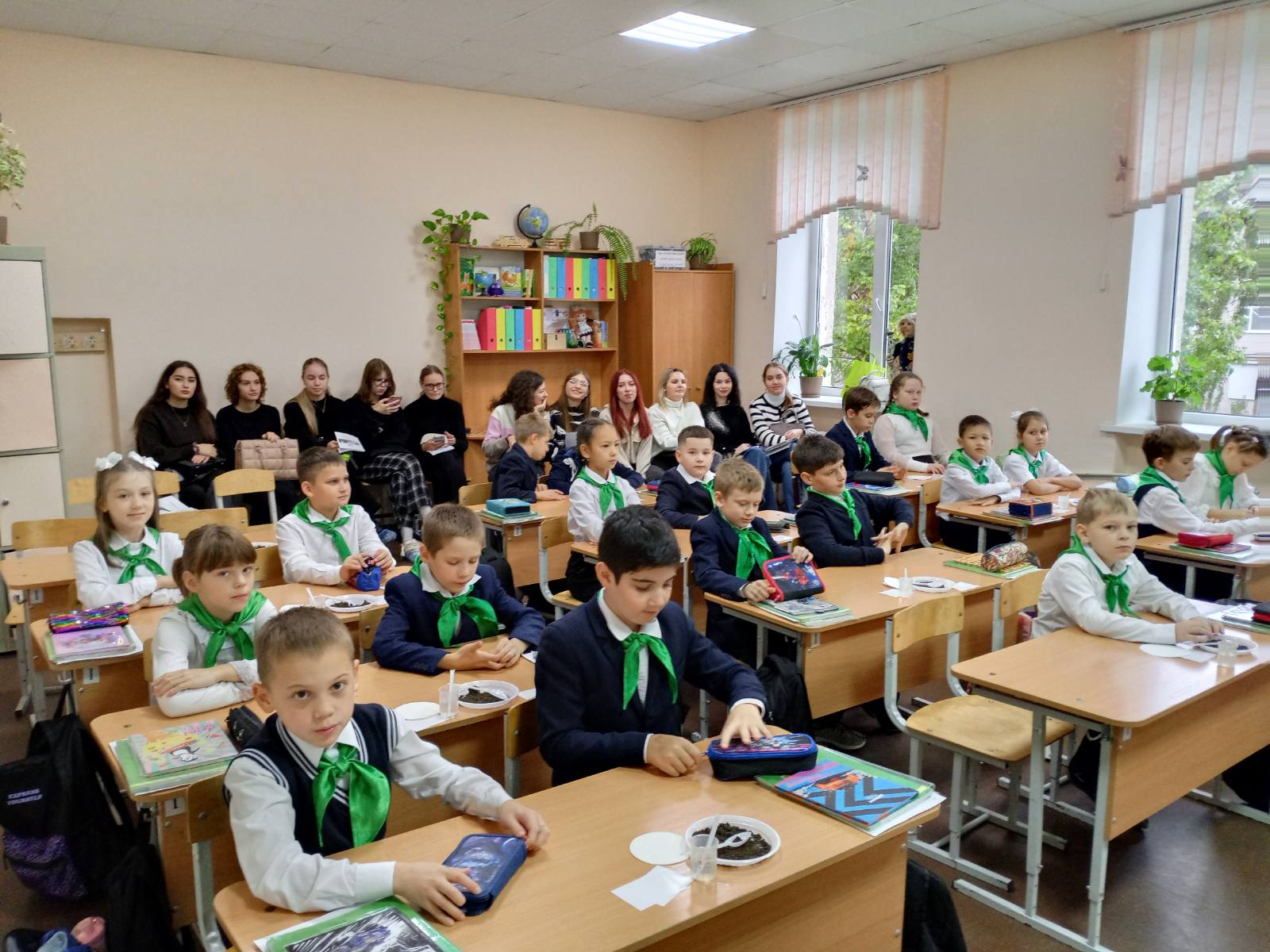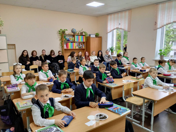 На уроке в 1 «В» классе «Что такое Родина» (учитель начальных классов Утешева Ферида Анатольевна) студенты наблюдали, как совместно с учащимися рассказать о традициях разных народов нашего города. Урок во 2 «В» классе «С чего начинается Родина» (учитель начальных классов Пахомова Светлана Васильевна) проходил в школьной музейной комнате. Совместно с педагогом ребята динамично обсудили понятие «малая родина», вспомнили, какие достопримечательности известны им в городе Саратове. А об истории микрорайона, в котором они живут, и истории школы им рассказала Муштакова Елена Ивановна, учитель истории и организатор музейной комнаты. Дети узнали о знаменитых выпускниках своей школы, многие обучающиеся поработали корреспондентами, взяли интервью у своих родных и узнали, как они учились в их родной школе. В 3 «А» классе урок «Почва - важнейшая часть экосистемы» (учитель начальных классов Проскудина Елизаветта Олеговна) имел исследовательский характер, ученики изучали почву и её свойства в ходе лабораторной работы. Игровой приём «Крестики Нолики» в конце урока позволил проверить, как учащиеся усвоили информацию об особой роли почвы в экосистеме. В ходе урока «Наши реки» в 4 «В» классе (учитель начальных классов Лигостаева Елена Николаевна) ученики составили схему реки, поработали с картой (нашли реки России и Саратовской области), с помощью приёма «Фиш-боун» конкретизировали проблемы экологии водоёмов (причины и способы ликвидации), написали синквейны на тему «Река», подвели итоги урока в ходе работы с «Кубиком Блума».
