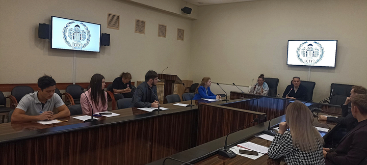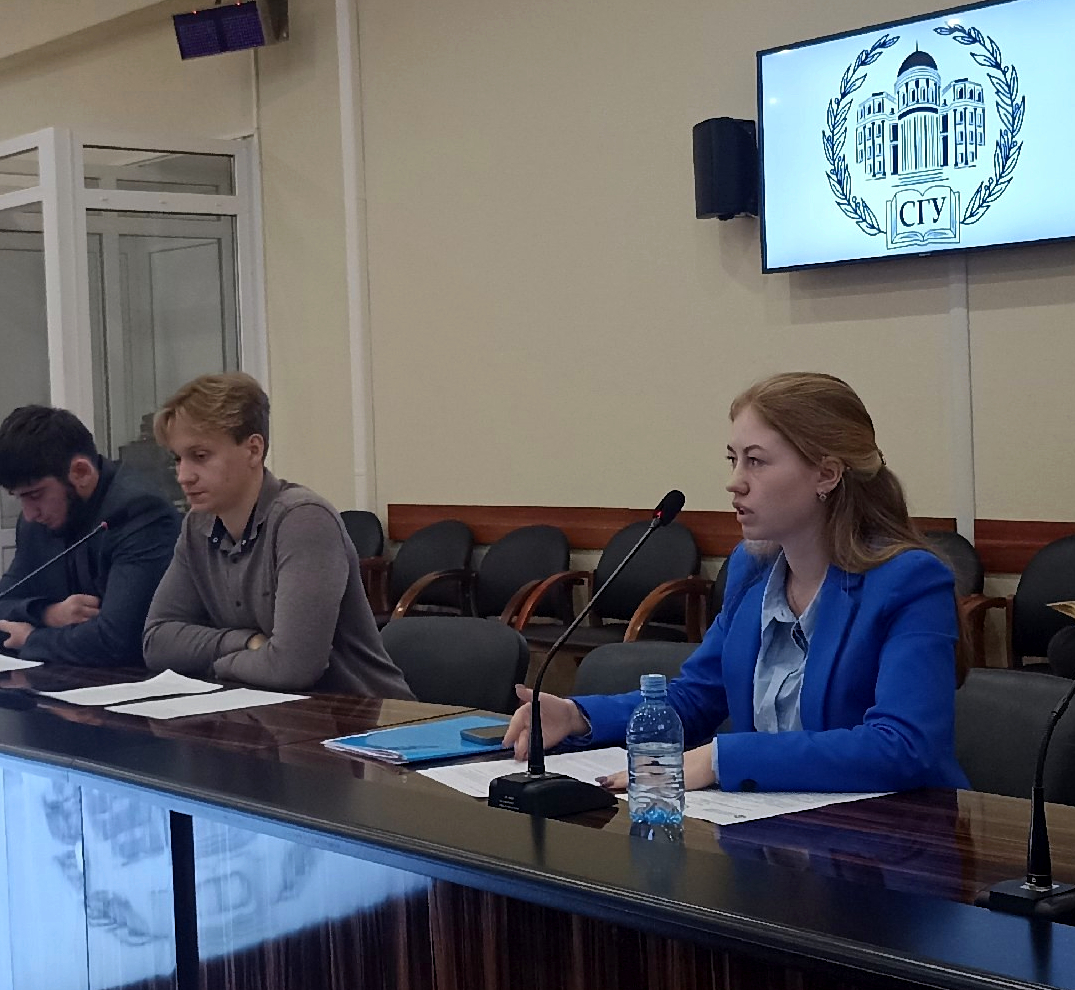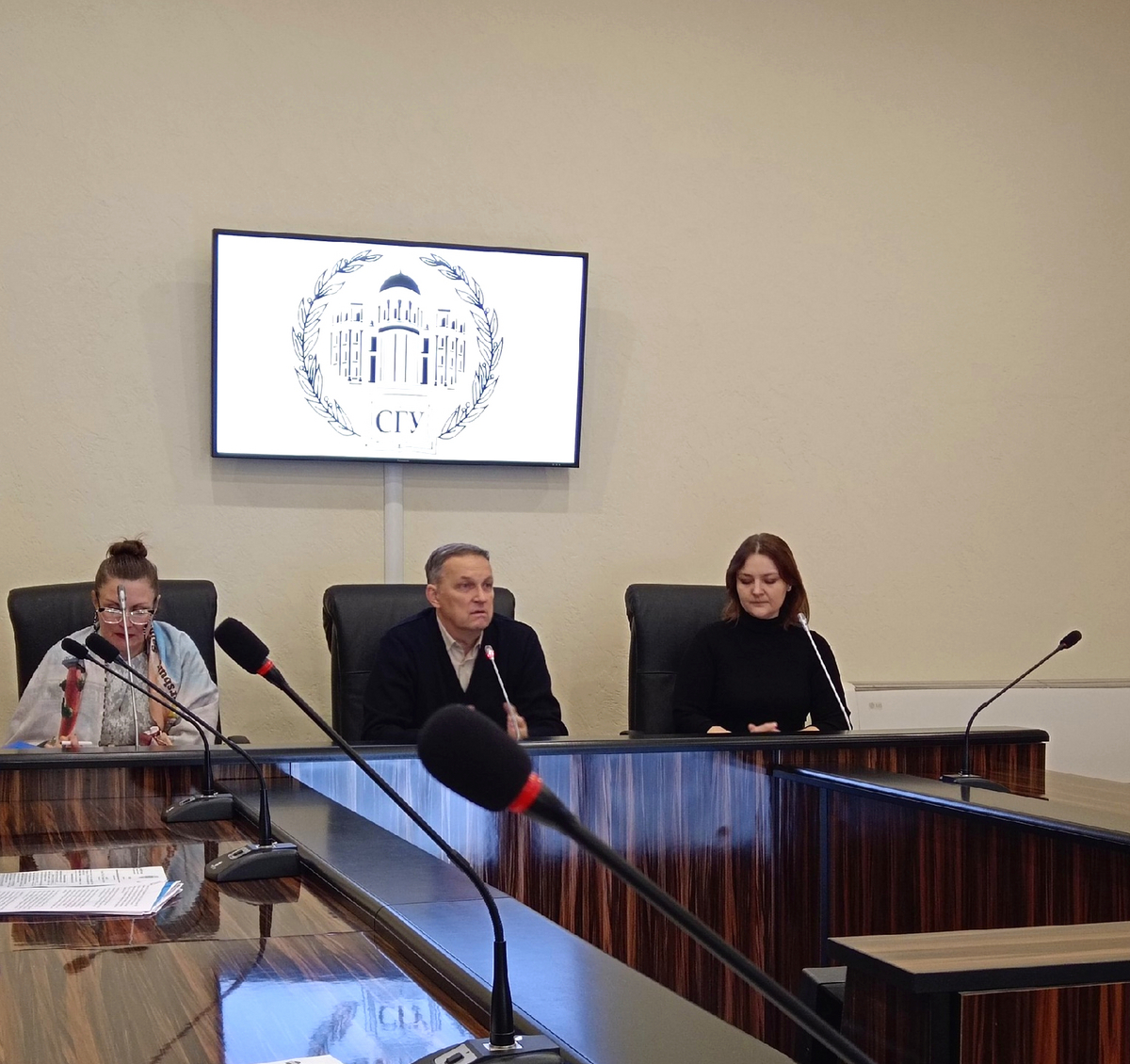 В президиум круглого стола вошли директор ИРСЭПИ, председатель Саратовского отделения Российской ассоциации содействия ООН Владимир Александрович Шашко, доцент кафедры международных отношений и внешней политики России Ольга Константиновна Рыбалко и член правления ИРСЭПИ Наталья Сергеевна Самылкина.