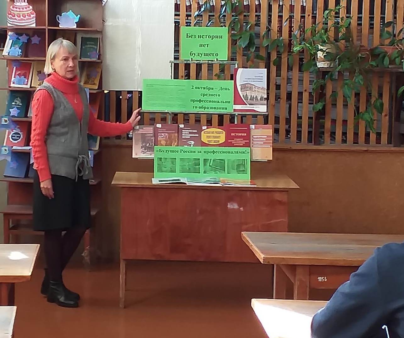 02 октября 2025 в библиотеке Колледжа радиоэлектроники имени П.Н. Яблочкова прошел познавательный час «Без истории нет будущего» для группы 1201 (классный руководитель Елена Анатольевна Машарова), посвященный Дню среднего профессионального образования. Провела познавательный час библиотекарь Светлана Александровна Вьюгова.