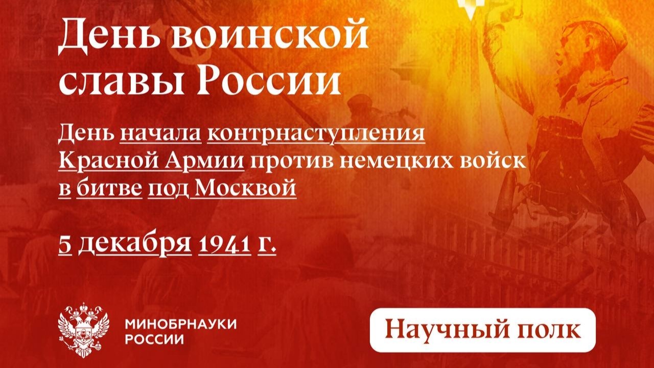 5 декабря – День воинской славы России – день начала контрнаступления советских войск против немецко-фашистских войск в битве под Москвой в 1941 году. Контратака стала вторым этапом Московской битвы в Великой Отечественной войне. Среди участников контрнаступления были студенты и преподаватели нашего университета.
