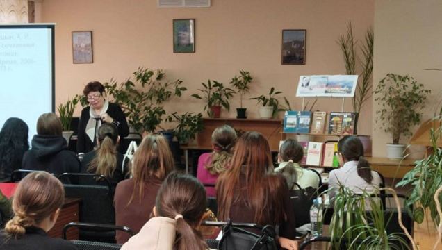 Сотрудники отраслевого учебного отдела общественных и педагогических наук ЗНБ СГУ приняли участие в очередном занятии для первокурсников факультета ГДРиИЯ по учебной дисциплине «Введение в специальность», на котором доцент кафедры русской филологии на базе МОУ «ГЭЛ» Лариса Владимировна Зимина знакомила будущих учителей литературы с творчеством Александра Исаевича Солженицына.