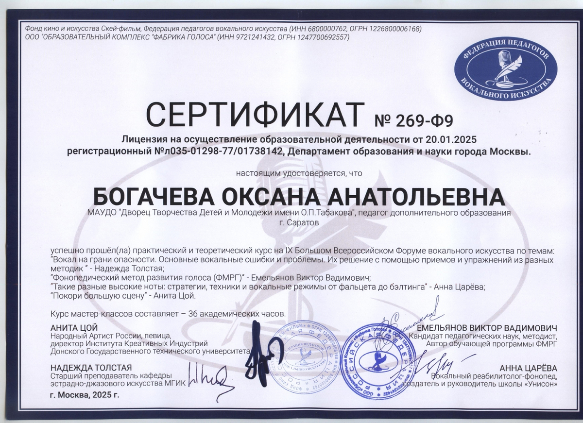 Преподавателю Богачевой О.А. выдан сертификат Федерации педагогов вокального искусства, г. Москва.
