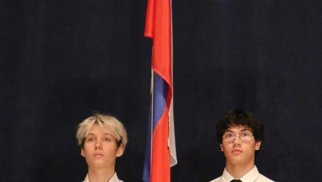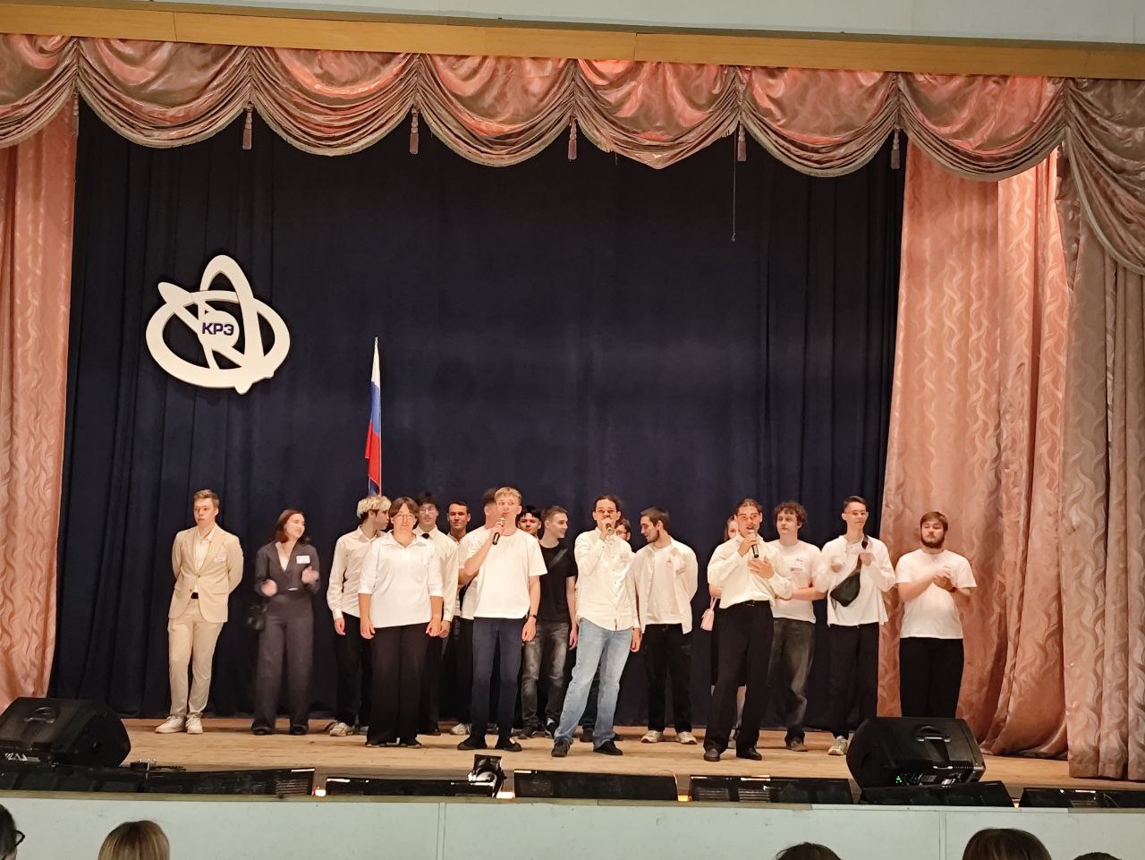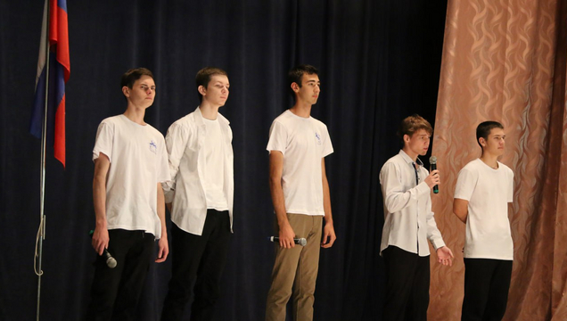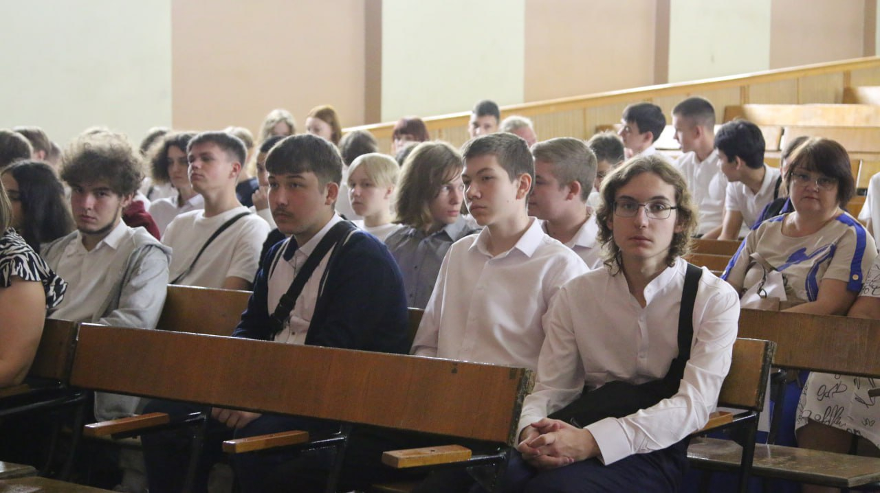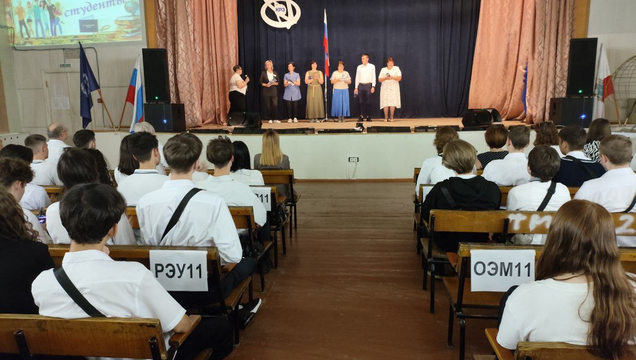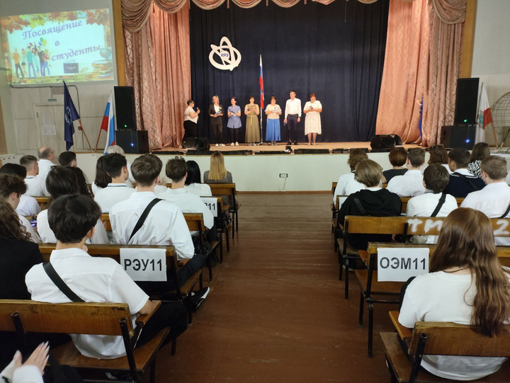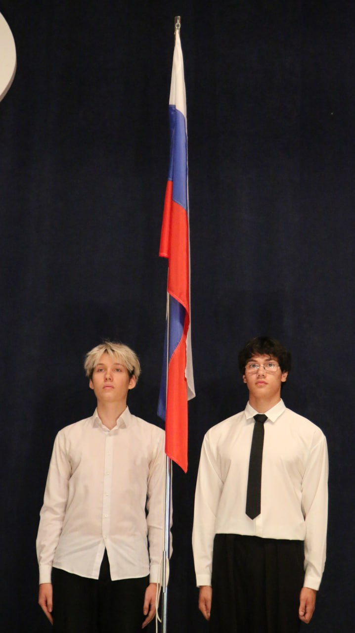 Торжественное собрание прошло в большом актовом зале. Были внесены флаги Колледжа и СГУ, и под гимн России был поднят флаг Российской Федерации.