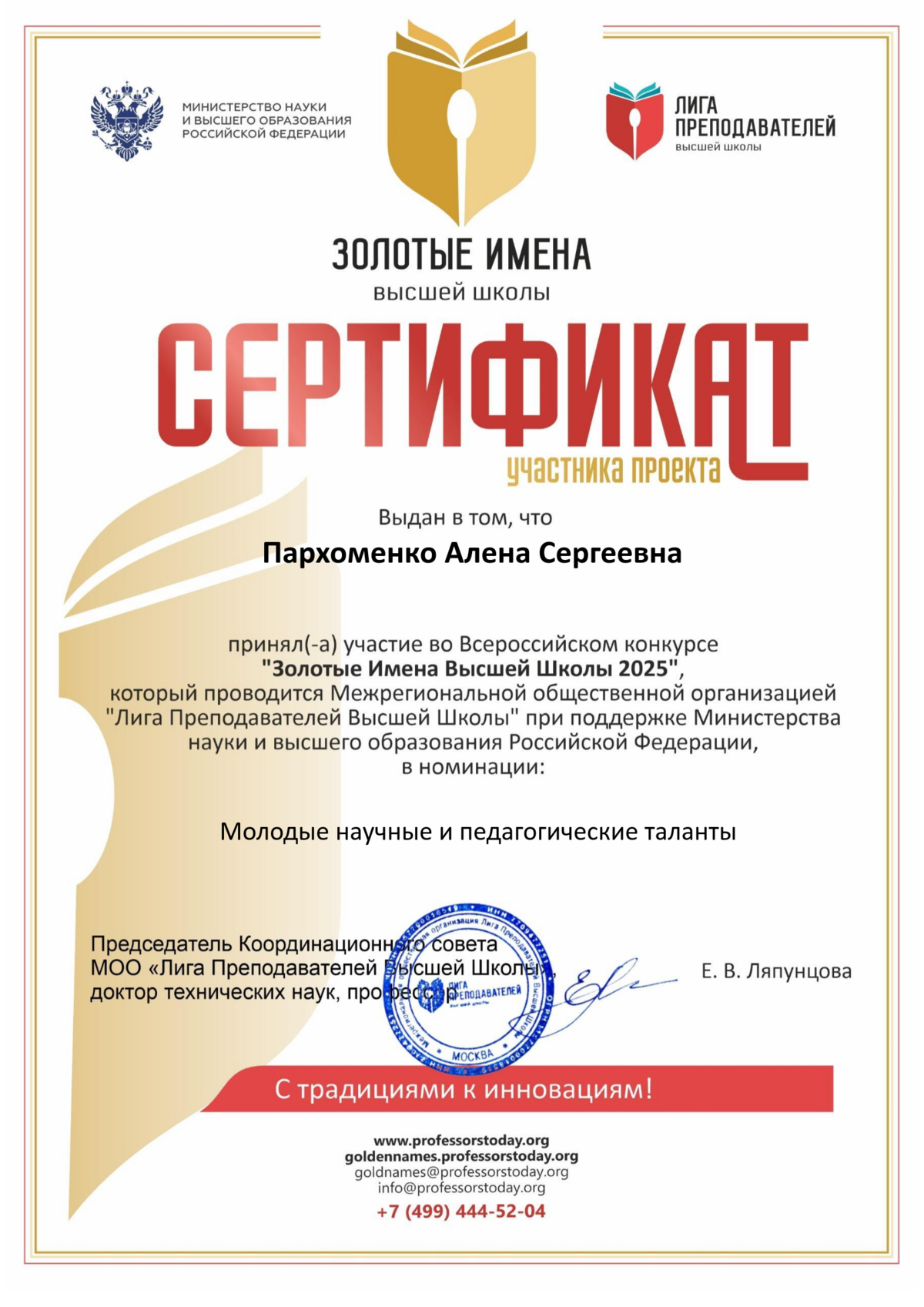 Подведены итоги Всероссийского конкурса «Золотые Имена Высшей Школы» 2025 года. Конкурс реализуется Общероссийской общественной организацией содействия развитию высшего образования «Лига Преподавателей Высшей Школы» при поддержке Министерства науки и высшего образования Российской Федерации. В число 195 лучших преподавателей вузов со всей страны, вошла молодой ученый Саратовского национального исследовательского государственного университета им. Н.Г. Чернышевского. Доцент кафедры генетики биологического факультета, к.б.н. Алёна Сергеевна Пархоменко победила в номинации «Молодые научные и педагогические таланты».