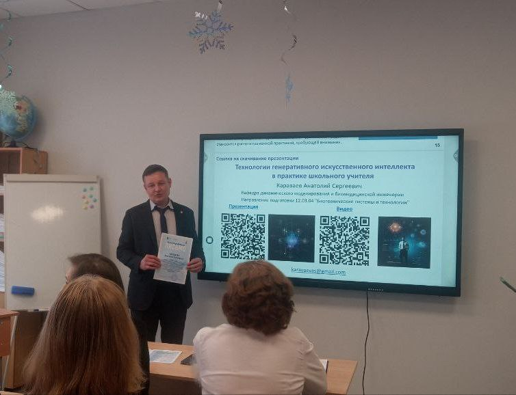 Заведующий кафедрой динамического моделирования и биомедицинской инженерии СГУ, профессор А.С. Караваев провёл для педагогов интерактивную сессию «Технологии генеративного искусственного интеллекта в практике школьного учителя». Участники на практике разобрали, как современные ИИ-инструменты могут стать помощниками в подготовке материалов, индивидуализации обучения и развитии проектного мышления обучающихся.