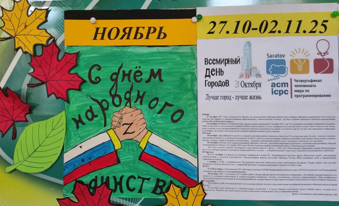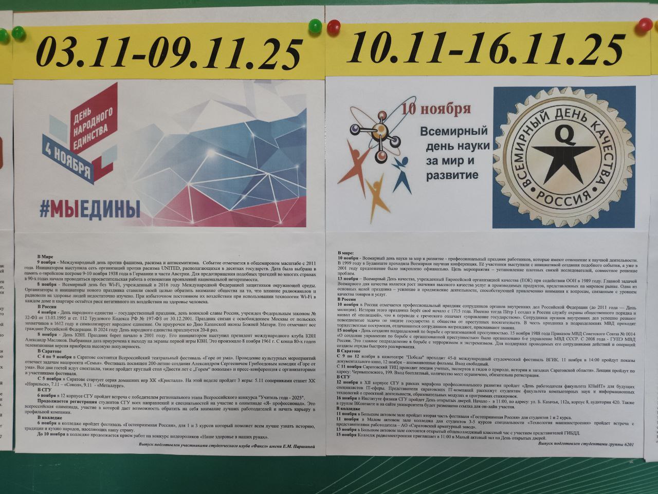Из еженедельных выпусков все узнали, когда отмечается Международный день против фашизма, Всемирный День информации и Международный день студентов. Отметили праздники России: День народного единства, день рождения КВН, профессиональные праздники. Из саратовских новостей самым интересно было узнать про студенческий фестиваль ВГИКи театральный фестиваль «Горе от ума», а также открытие Ботанического сада СГУ.
