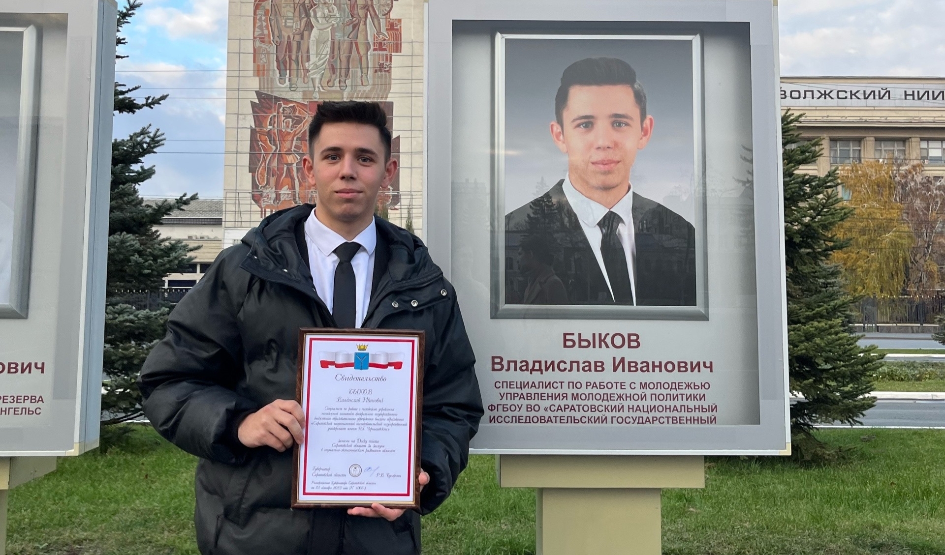 1 ноября Губернатор Саратовской области Р.В. Бусаргин вручил магистранту социологического факультета СГУ, специалисту по работе с молодёжью Управления молодёжной политики университета, «Студенту года 2024» Владиславу Быкову свидетельство о занесении его портрета на доску почёта Саратовской области за заслуги в социально-экономическом развитии региона.