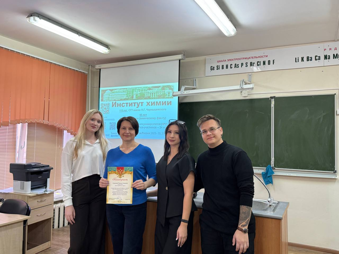 А вот в МАОУ «Лицей №37» Институт химии представила сразу группа студентов 1 и 2 курса – Никита Косырев (231 гр.), Александра Петренко и Анна Рябова, наши первокурсницы (131 гр.). Благодарим учителя химии Семенову Татьяну Семеновну за гостеприимство!
