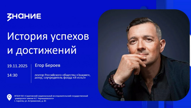 19 ноября лектор Российского общества «Знание», актёр, соучредитель фонда «Я есть!» Егор Бероев встретится с участниками Молодёжного съезда студентов. Мотивационная лекция пройдёт на площадке Саратовского университета.