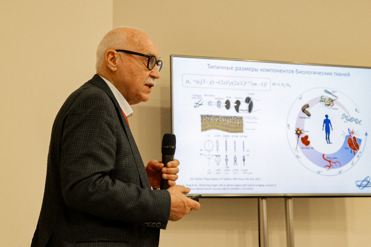 Валерий Викторович представил оптические методы исследования биотканей. В каждой лаборатории учёные-биофотоники работают со спектрометрами, которые измеряют отражённый и прошедший световые сигналы. Более сложные установки позволяют получить детальную информацию о структуре тканей, движении эритроцитов и лимфоцитов; безболезненно «раскладывать» в микроскопическом объёме материал ткани до ионов и атомов. В мире, например, более 150 компаний, которые разрабатывают оптические когерентные томографы, в значительной степени свободные от вредного влияния многократного рассеяния на результаты анализа ткани.