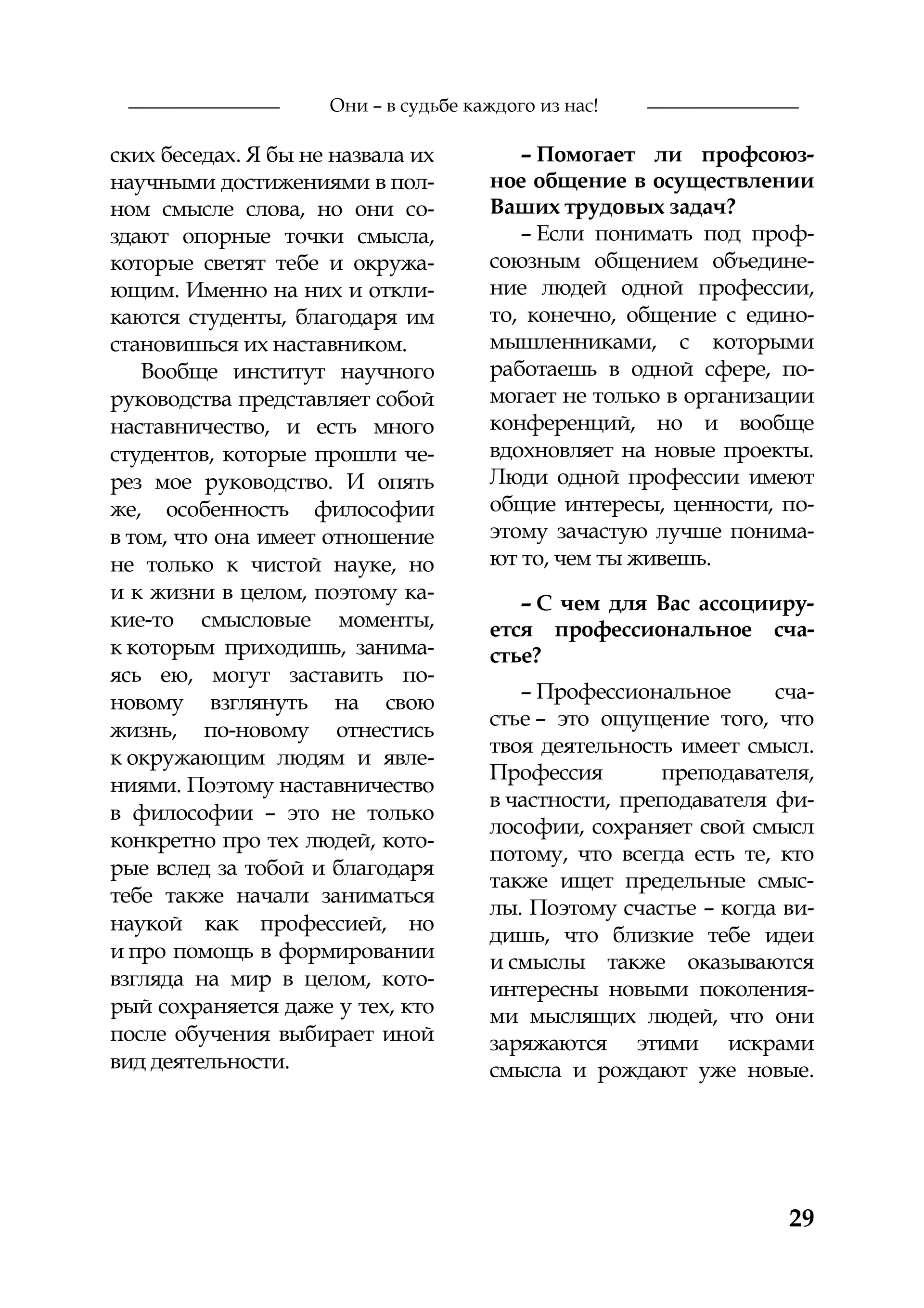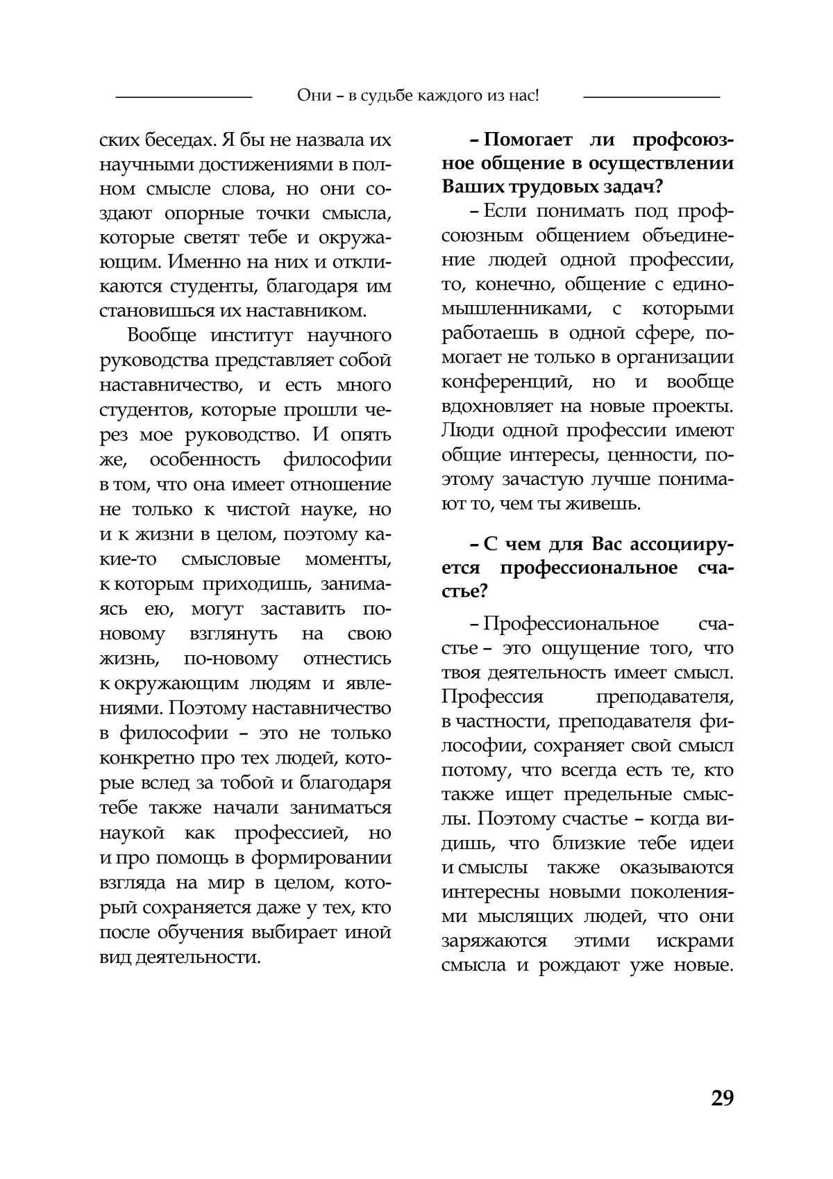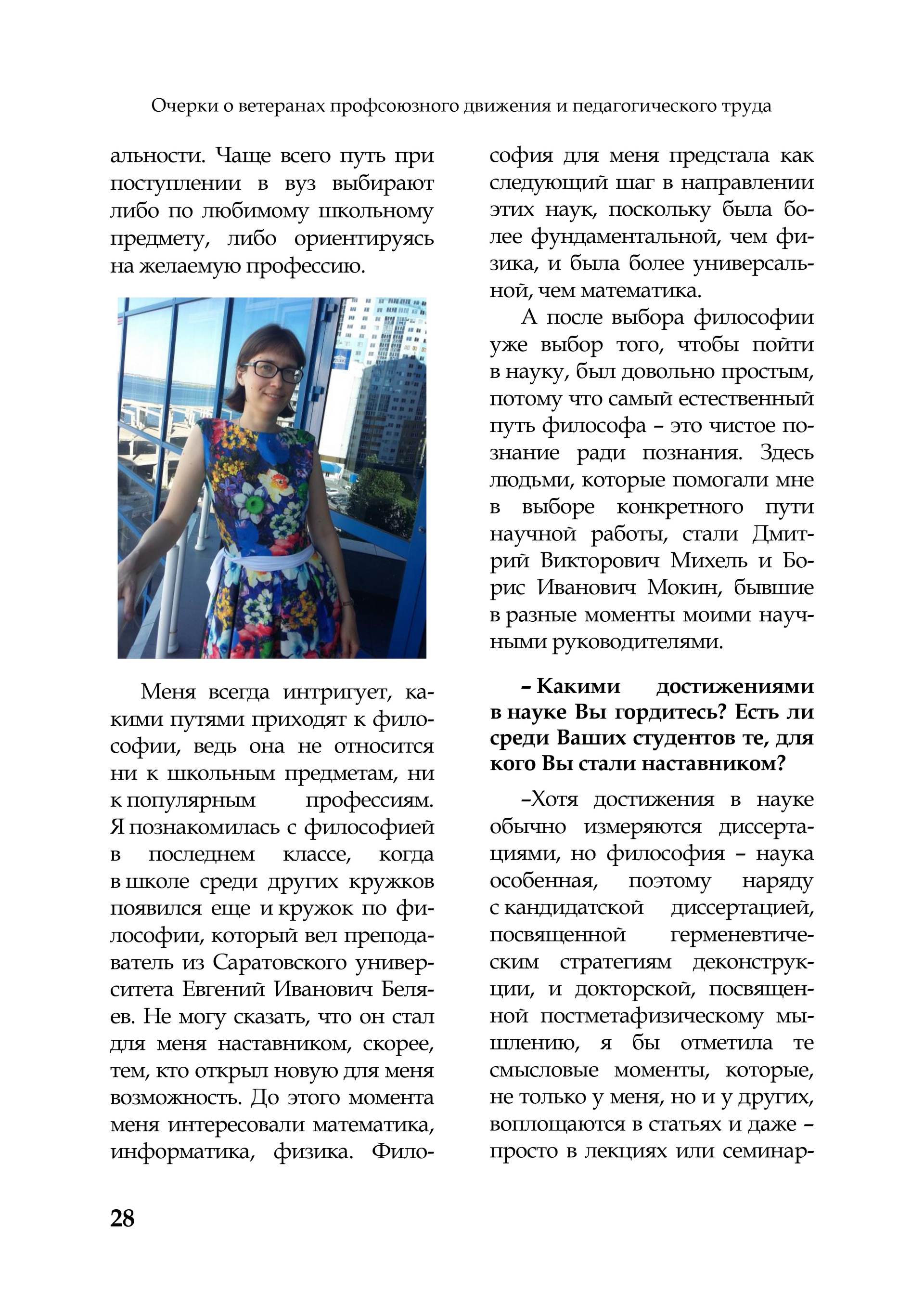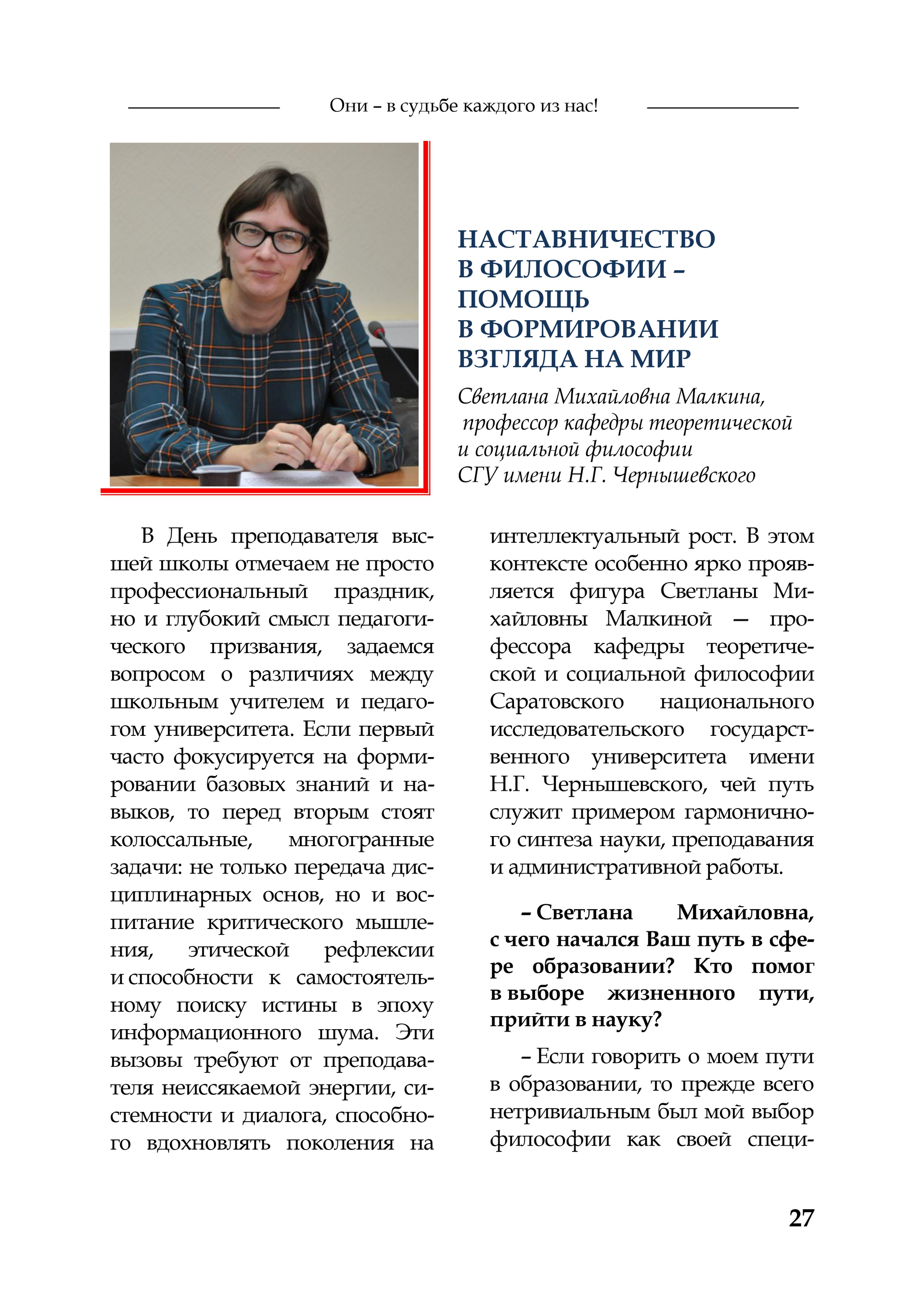 В издании представлена статья-интервью «Наставничество в философии – помощь в формировании взгляда на мир» о профессоре кафедры теоретической и социальной философии СГУ имени Н.Г. Чернышевского, докторе философских наук Светлане Михайловне Малкиной.