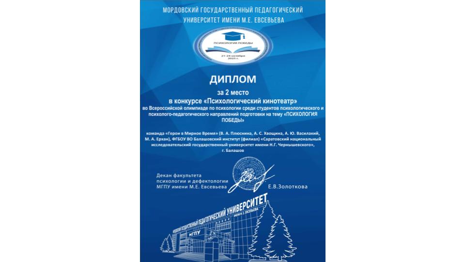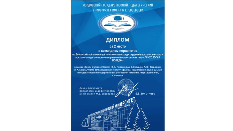 Студенты-психологи приняли участие во Всероссийской онлайн-олимпиаде «Психология Победы», посвященной Году защитника Отечества, организованной Мордовским государственным педагогическим университетом имени М. Е. Евсевьева для студентов психологических и психолого-педагогических направлений. Участниками олимпиады стали 18 команд из разных регионов России. В состав команды Балашовского института СГУ «Герои в Мирное время» вошли Вера Плюснина, Анастасия Хвощина, Мария Ерхан и Алина Василакий, наставником которой выступила заведующая кафедрой педагогики и психологии О. В. Карина.