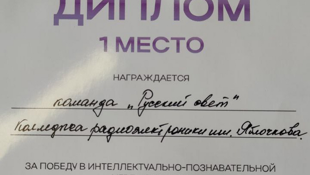 Поздравляем команду нашего колледжа «Русский свет» в составе Елистратова Ольга, Осипов Степан (группа 9373), Санникова Дарья (группа 9371), Седлов Ярослав (группа 6301), Жуков Матвей (группа 9271)с победой!!!