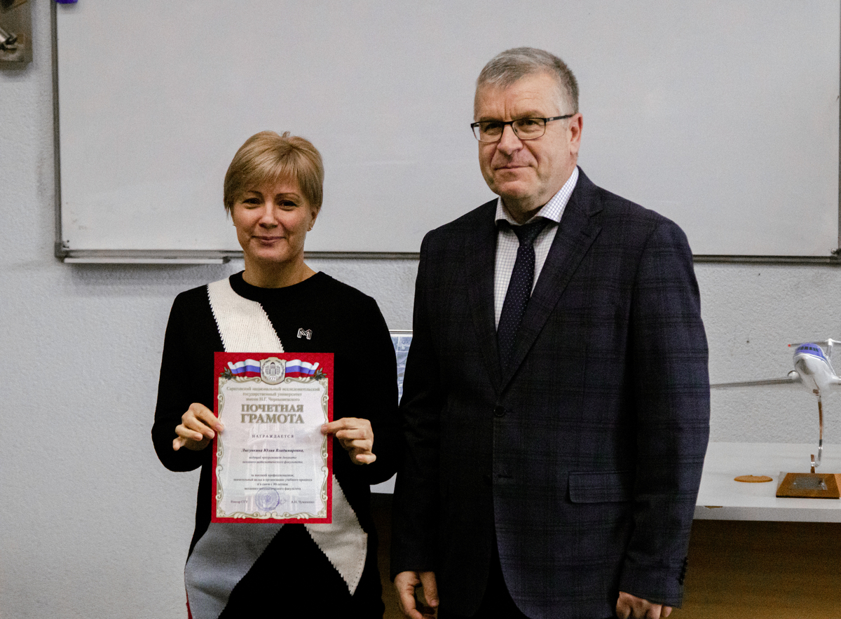 Грамотами ректора СГУ были награждены директор компании «Neoflex» Р.Б. Родионов и директор креативного кластера «Дизайн центр» Д.Б. Козюкин.