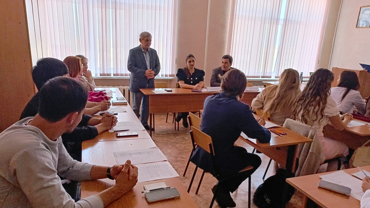 После этого студентам 4 курса профилей «Русский язык. Литература» было предложено в качестве соискателей пройти процедуру собеседования с потенциальными работодателями, в роли которых в ходе деловой игры выступили директор МАОУ СОШ № 9 имени П.А. Столыпина г. Балашова А.Г. Рыжков и заместитель директора по воспитательной работе МАОУ СОШ № 3 г. Балашова Ю.А. Поберий.