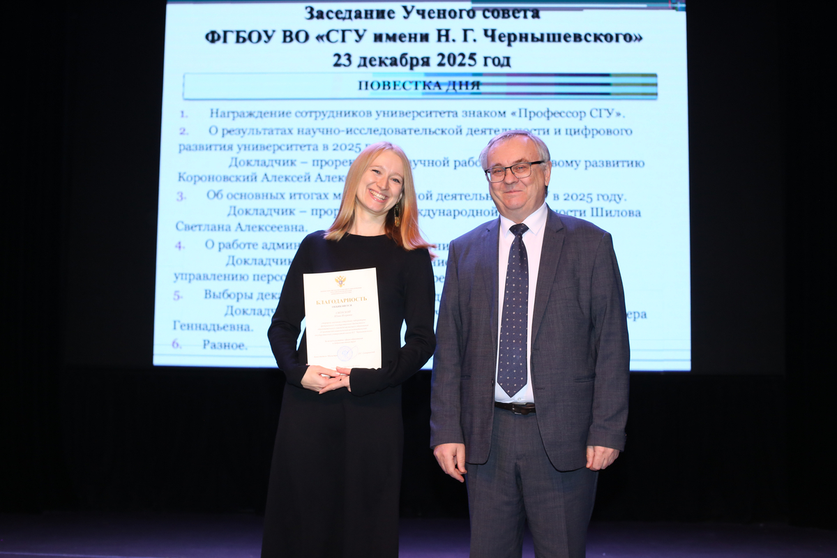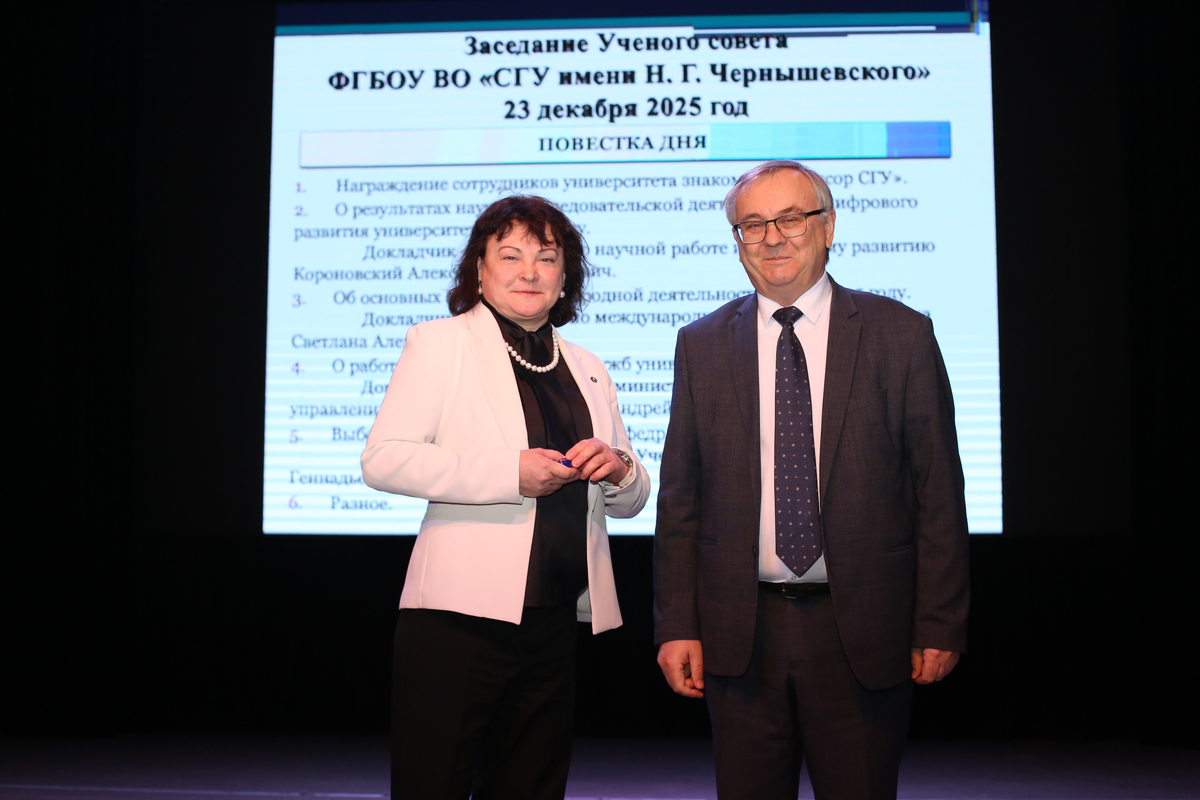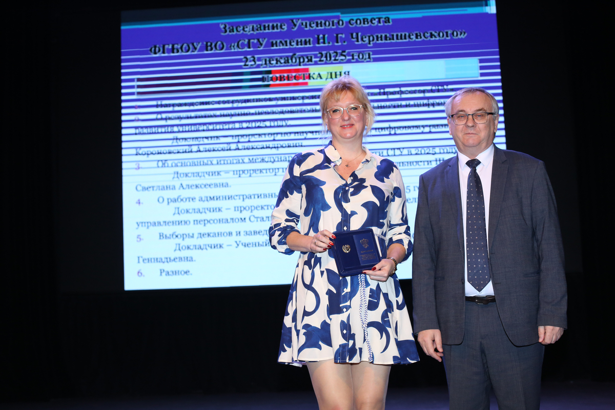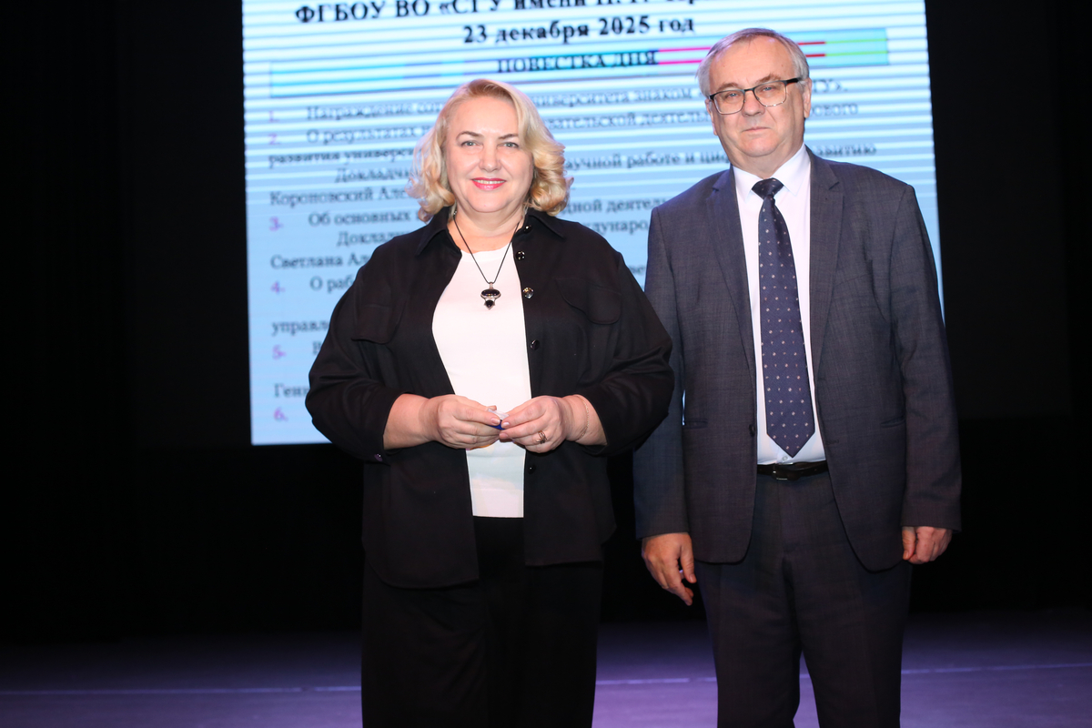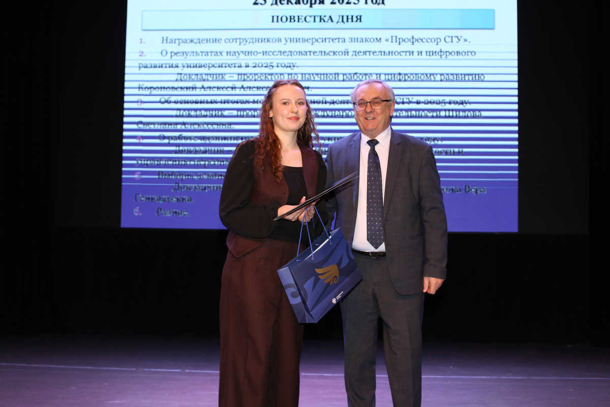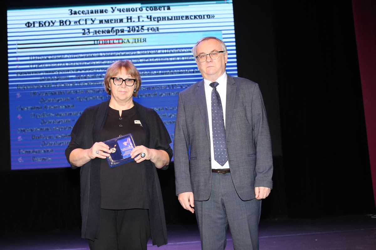 Традиционно в конце года сотрудникам университета вручают знак «Профессор СГУ». В 2025 году наградили четверых преподавателей, их трудовой стаж – более 30 лет: