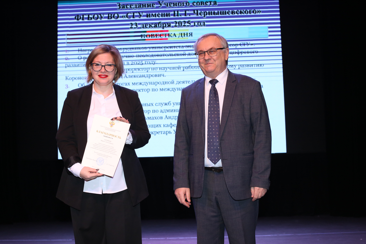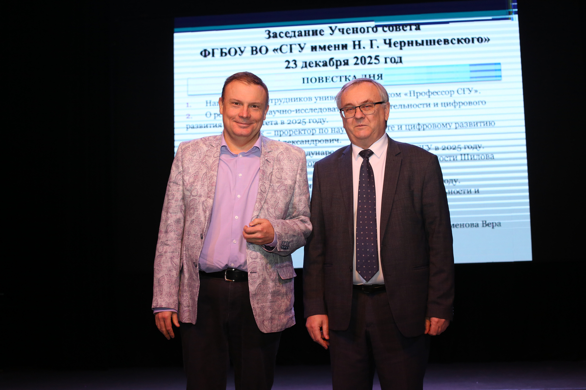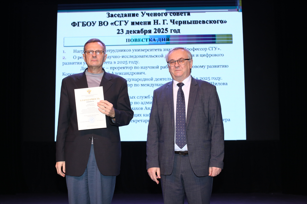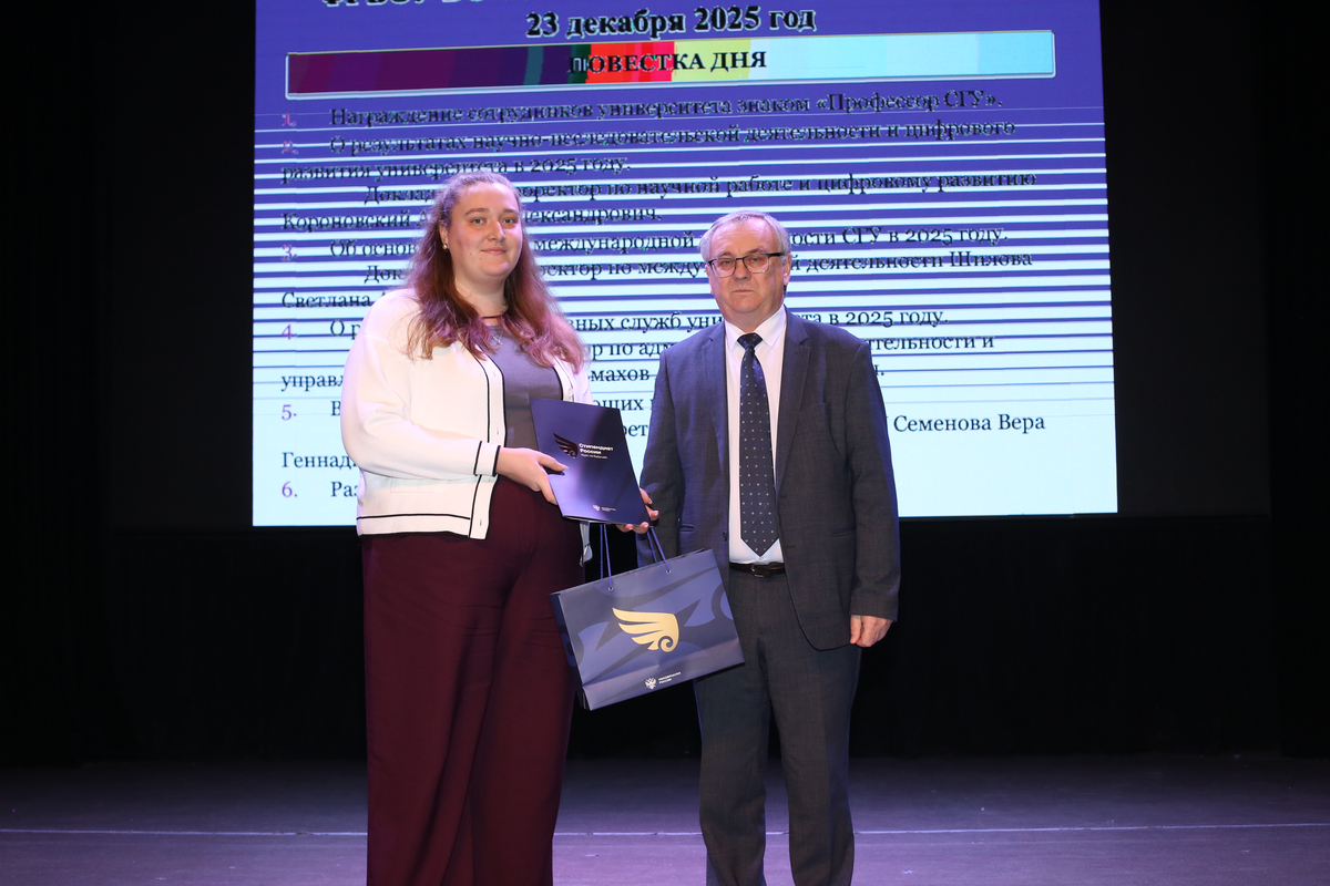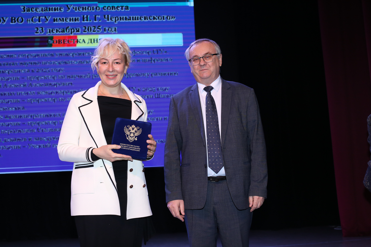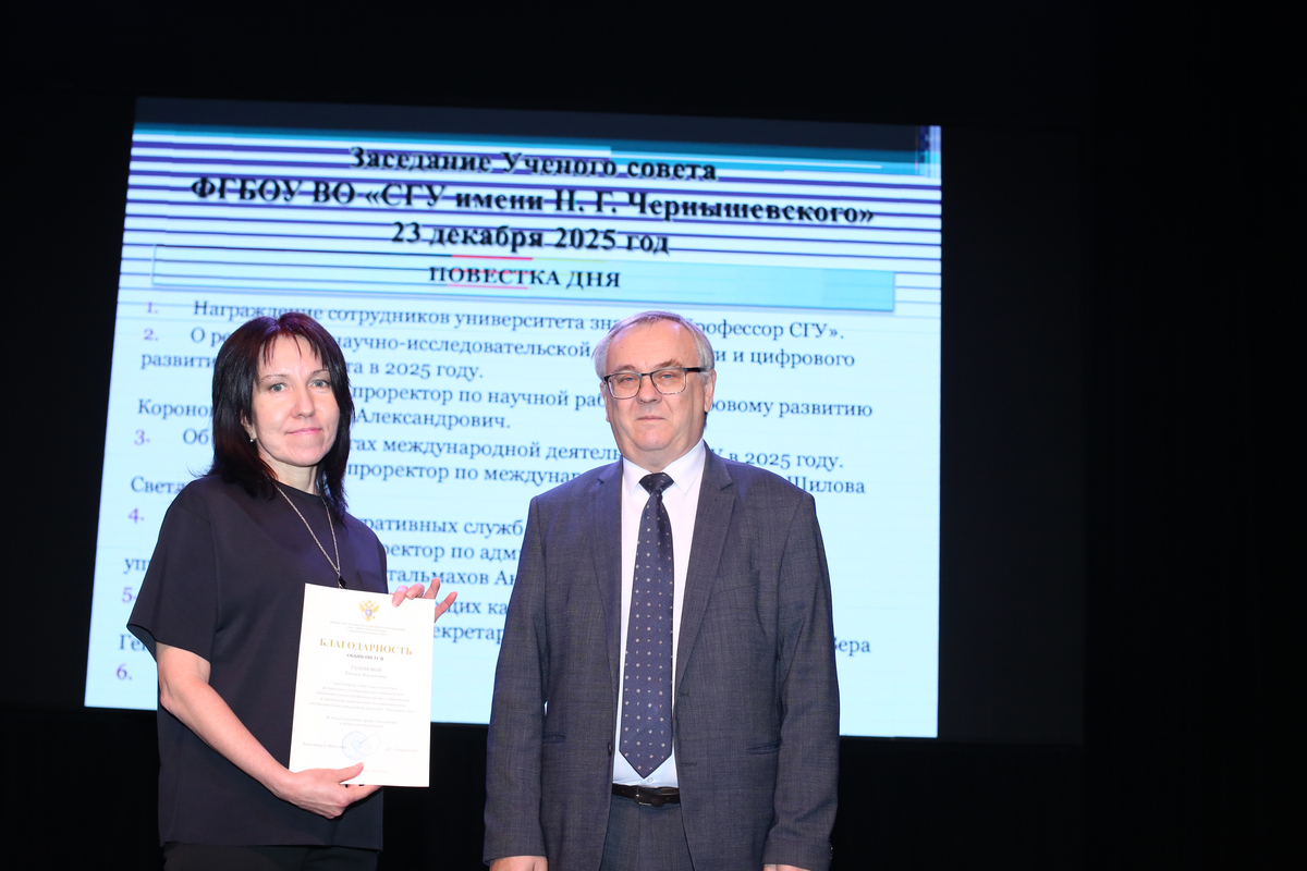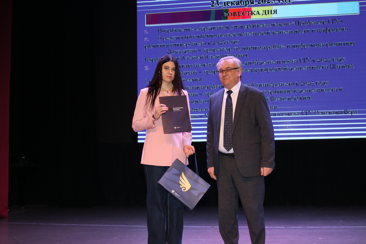Традиционно в конце года сотрудникам университета вручают знак «Профессор СГУ». В 2025 году наградили четверых преподавателей, их трудовой стаж – более 30 лет: