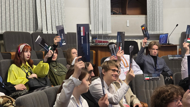 Знакомство продолжилось в интерактивном формате: студенты участвовали в опросе на знание управленческого аппарата университета. Самый эрудированный участник получил в награду фирменную футболку Студсовета. Далее Владислав подробно рассказал о структуре вуза, учебный процесс обеспечивают 22 структурных подразделения.