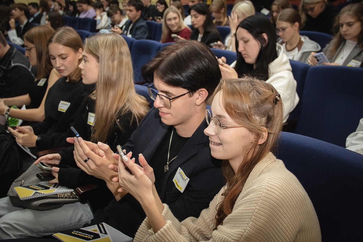 После регистрации каждый участник получил фирменный набор студента: блокнот и ручку для заметок. Открыл мероприятие председатель Совета студентов и аспирантов СГУ Владислав Быков. Он представил аудитории руководство совета и десять кураторов, которые будут работать по разным направлениям.