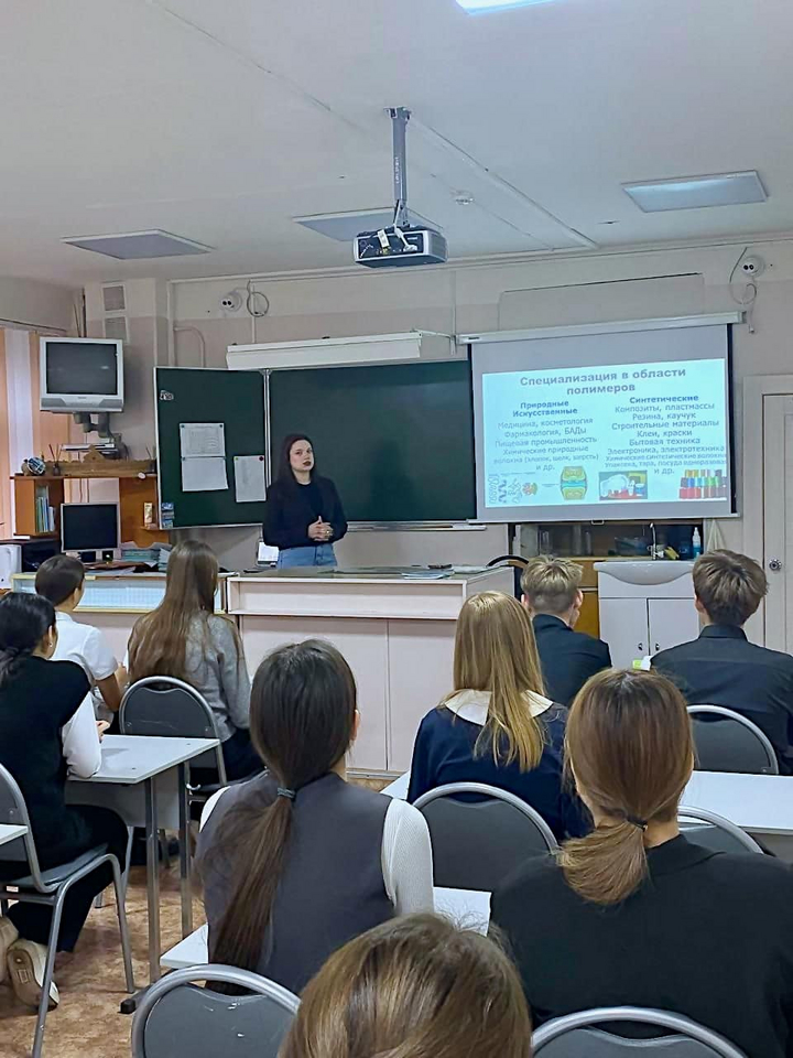 Рассказы об Институте химии, его истории, направлениях обучения, учебе, науке, летней практике, спорте, волонтерстве и не только, ребята сопровождают презентацией с фотографиями, а ученики всегда задают много вопросов.
