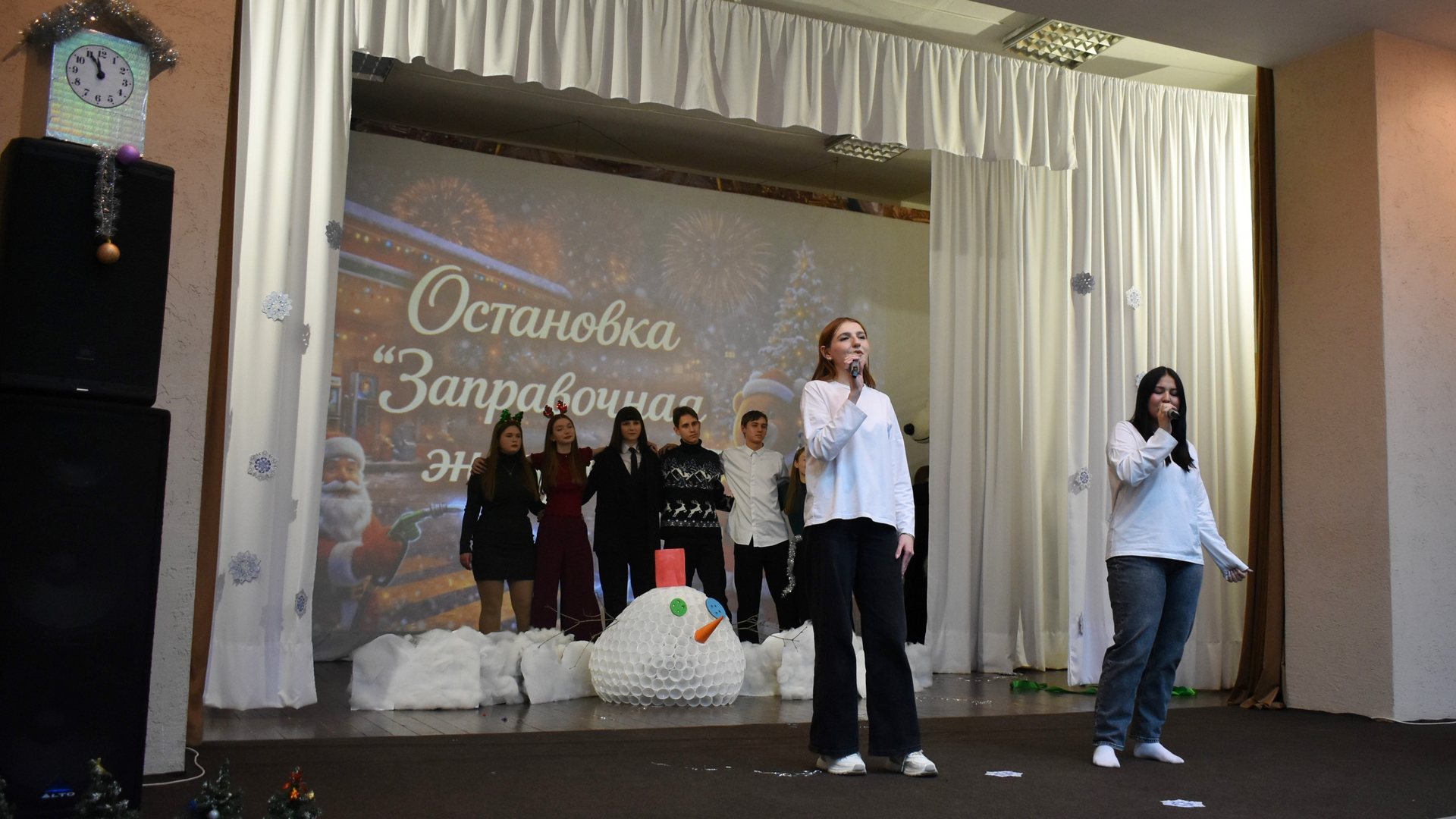 Путешествие началось с энергичного старта от неутомимых Водителя (Е. Мирзалиевой) и Контролера (К. Масленниковой), которые объявили о начале маршрута № 2025-2026 от станции «Сессия начинается» до конечной «Новый год». Сразу же пассажиры попали на первую остановку – «Разминку для мозгов», где сыграли в динамичную игру «Ёлочка-стулочка», поднявшую настроение и запустившую праздничный драйв.