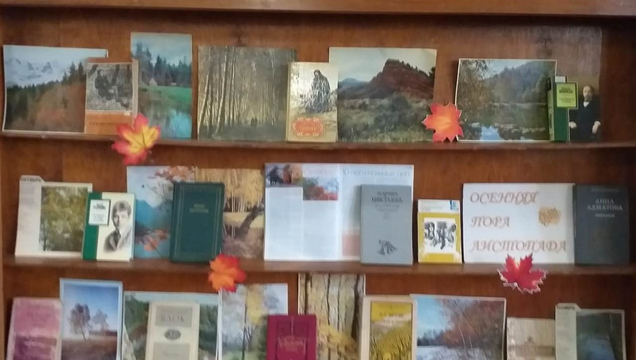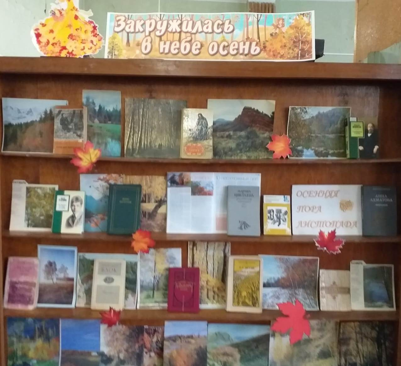 К мероприятию в библиотеке КРЭ открылась книжно – иллюстративная выставка «Закружилась в небе осень», на которой представлены произведения поэтов, журналы и осенние пейзажи.