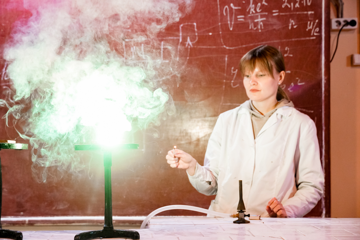 На очередном занятии Школы технологического лидерства старшеклассники узнали о фундаментальных основах химии и её роли в формировании современной научной картины мира. Лекция вышла за рамки традиционного формата, объединив теорию, зрелищные эксперименты и командную работу. Занятие для десятиклассников – будущих техлидеров – провела доцент кафедры общей и неорганической химии И.В. Кузнецова.