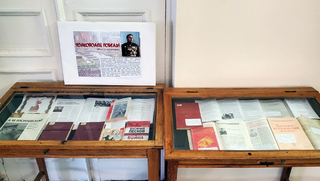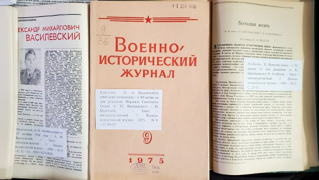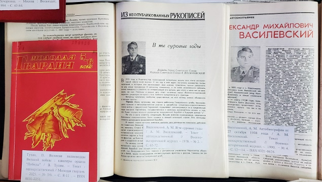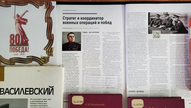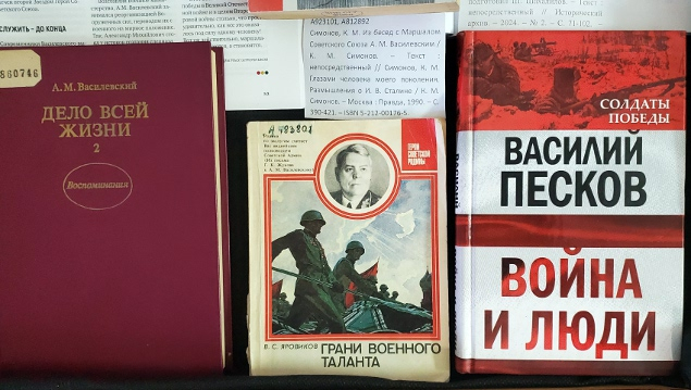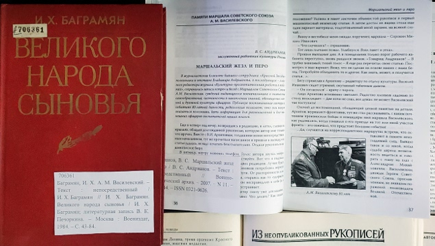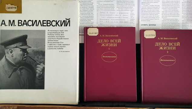 На выставке представлена литература о жизни и деятельности маршала Василевского: это двухтомник воспоминаний маршала «Дело всей жизни», книги: К. М. Симонова «Из бесед с Маршалом Советского Союза А. М. Василевским», В. С. Яровикова «Грани военного таланта: о Маршале Советского Союза А. М. Василевском», В. М. Пескова «Война и люди», фотоальбом «А. М. Василевский» и другие; статьи из российских журналов: «Исторический архив», «Военно-исторический журнал», «Военно-исторический архив», «Наш современник», «Новая и новейшая история» и другие.