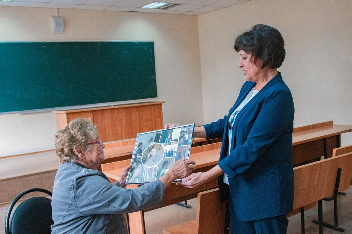 Ведущий программист отдела разработок и внедрения информационных систем управления СГУ, председатель Совета ветеранов университета Г.В. Соколова поздравила коллегу с юбилеем и преподнесла памятный подарок от лица администрации Кировского района.