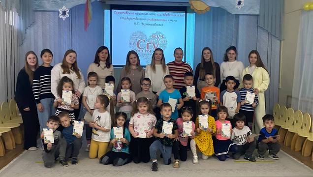 Полина Буренина, Кристина Вуткарева, Мария Запасчикова, Елизавета Непомящая, Анастасия Полуцыган, Надежда Фенченко под руководством доцента кафедры методологии образования Ольги Анатольевны Козловой превратили обычный день в детском саду в большое приключение: доступным языком рассказали детям о Саратовском университете: объяснили, что такое ВУЗ, зачем туда поступают, и каково это - быть студентом. Теперь «студент» и «университет» для дошкольников не просто абстрактные понятия, а интересная перспектива.