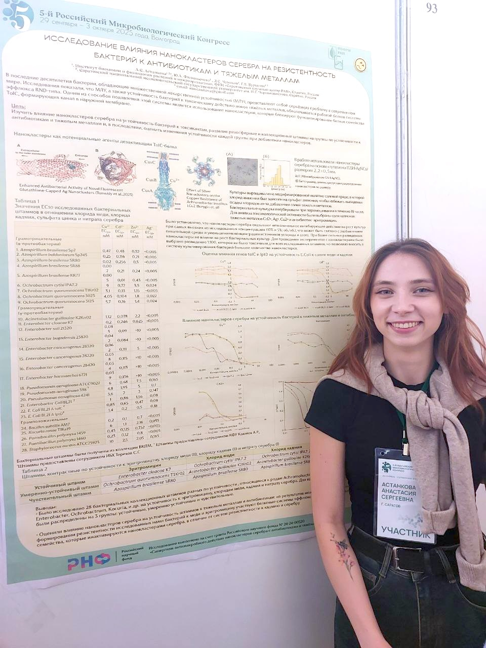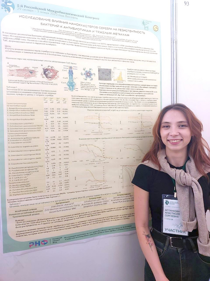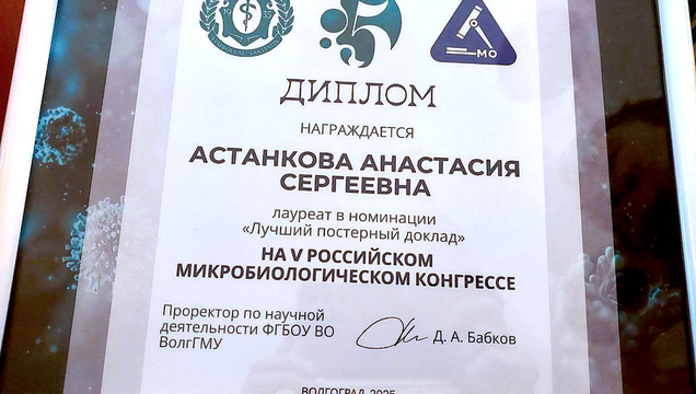 Микробиологический Конгресс – это крупнейшая в России площадка по обсуждению всех аспектов исследования микроорганизмов, проходит регулярно раз в 2 года. В этом году Конгресс состоялся в Волгограде (29 сентября - 3 октября 2025 г.) и собрал 354 исследователя из 28 городов России, Беларуси и Армении. В постерной сессии было представлено 298 докладов, разделённых на 3 блока, в каждом из которых комиссией был выбран один победитель. Анастасия Астанкова стала лауреатом в блоке №2 (секции «Микробные технологии», «Медицинская микробиология» «Бактериофаги и другие вирусы прокариот»).