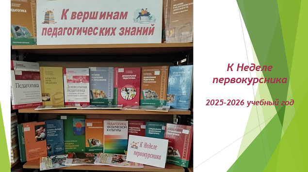 В рамках «Недели первокурсника» для студентов Педагогического института подготовлена книжная выставка «К вершинам педагогических знаний».