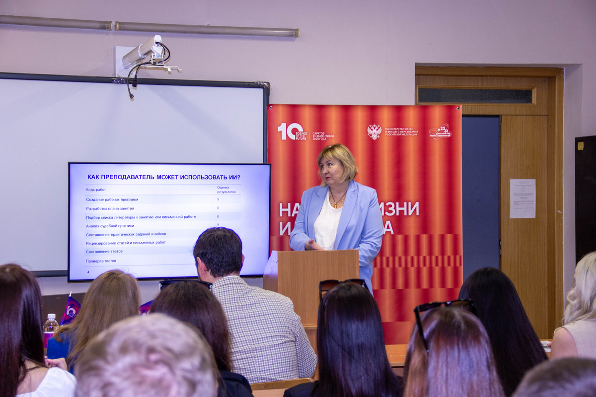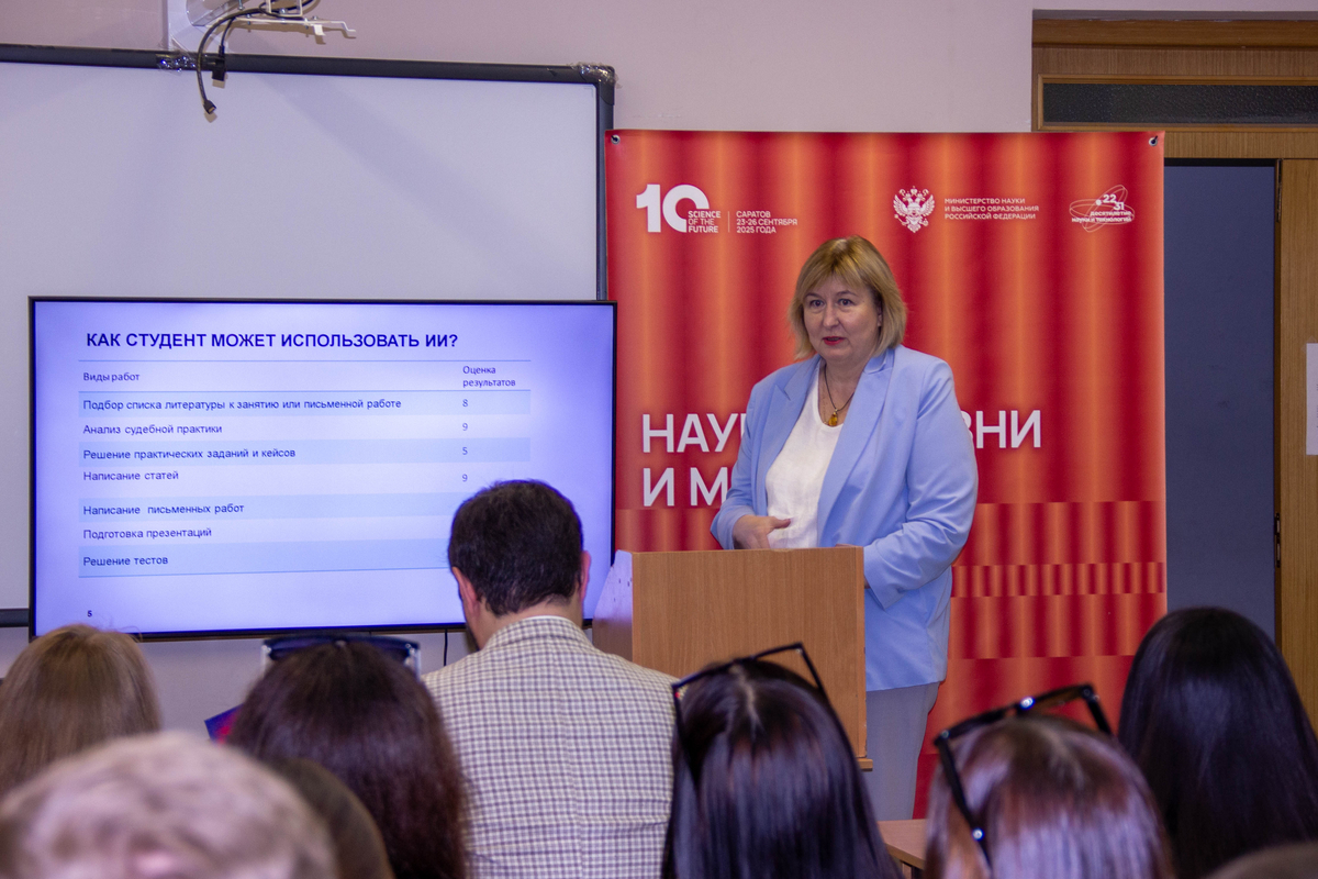 Куликова Светлана Анатольевна, д-р юрид. наук, профессор кафедры конституционного и муниципального права Саратовского национального исследовательского государственного университета имени Н.Г. Чернышевского представила доклад, в котором использование ИИ в образовательном процессе рассматривалось со стороны преподавателя и студента. Докладчик остановилась на рисках и положительных сторонах использования ИИ при проведении различных форм обучения.