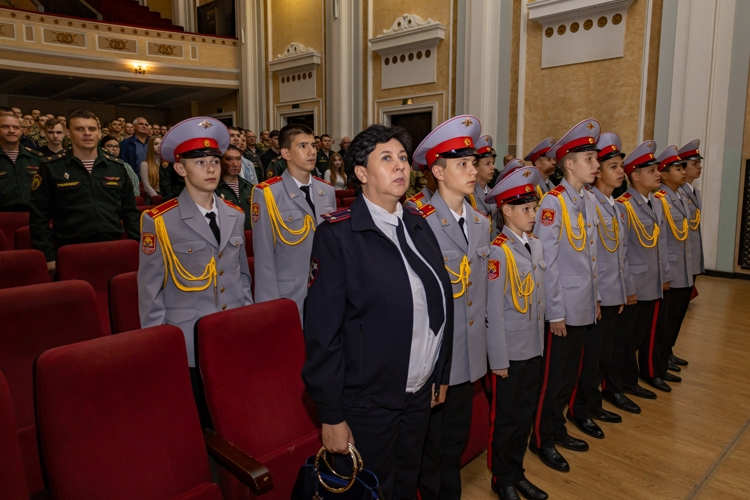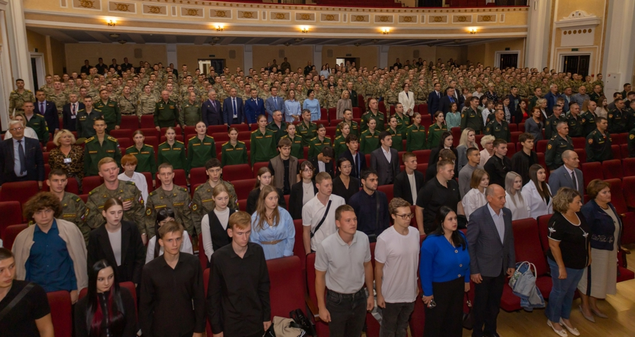 С большим волнением представители нашего факультета встретили торжественное внесениезнамени Российской Федерации, а также исполнение гимна всеми курсантами, что прозвучало особенно торжественно и символично. Особенную неповторимость торжественной части придало выступление военного оркестра с патриотическими мелодиями на фоне документальных кадров о Великой отечественной войне, что заставило зал встать.