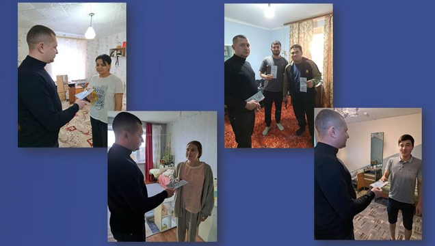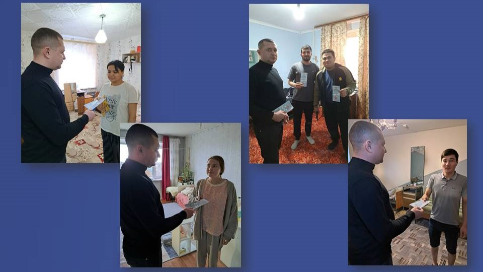 После общего собрания состоялся обход жилых комнат, в ходе которого О.С. Грицинин лично пообщался со студентами и вручил им информационные буклеты, разъясняющие вопросы уголовной ответственности за преступления, связанные с незаконным оборотом наркотиков.