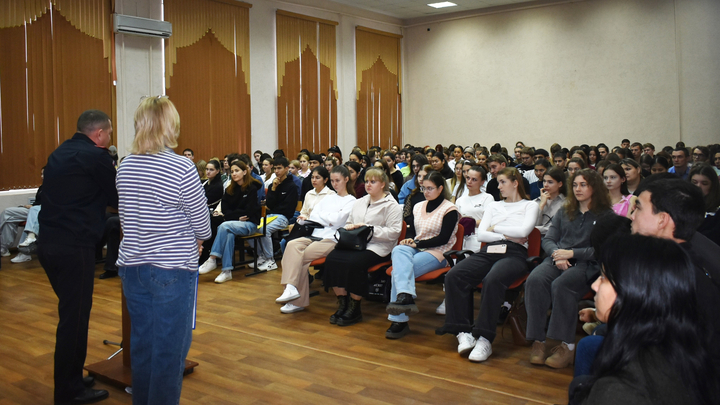 Основное мероприятие прошло в актовом зале института, где собрались студенты разных курсов. Встречу открыла начальник отдела по воспитательной и социальной работе Т.А. Котова: «Сегодня мы собрались для разговора на одну из самых сложных и тревожных тем современности – тему распространения и употребления психоактивных веществ. Это не абстрактная проблема где-то там, в большом мире, это реальная угроза, которая может коснуться любого, независимо от уровня образования, социального статуса или круга общения. Молодежь, к сожалению, находится в особой группе риска – в период активного поиска себя, нового окружения и порой под влиянием ложных иллюзий о «легких» решениях проблем, совершаются роковые ошибки. Именно поэтому наша с вами общая задача – сделать все возможное, чтобы этих ошибок не допустить. Профилактика – это не просто слово из лексикона педагогов и правоохранителей. Это практика ответственного отношения к собственной жизни. Это понимание, что ваше здоровье – это не возобновляемый ресурс, а ваша безопасность – фундамент, на котором строится все: карьера, семья, личное счастье».