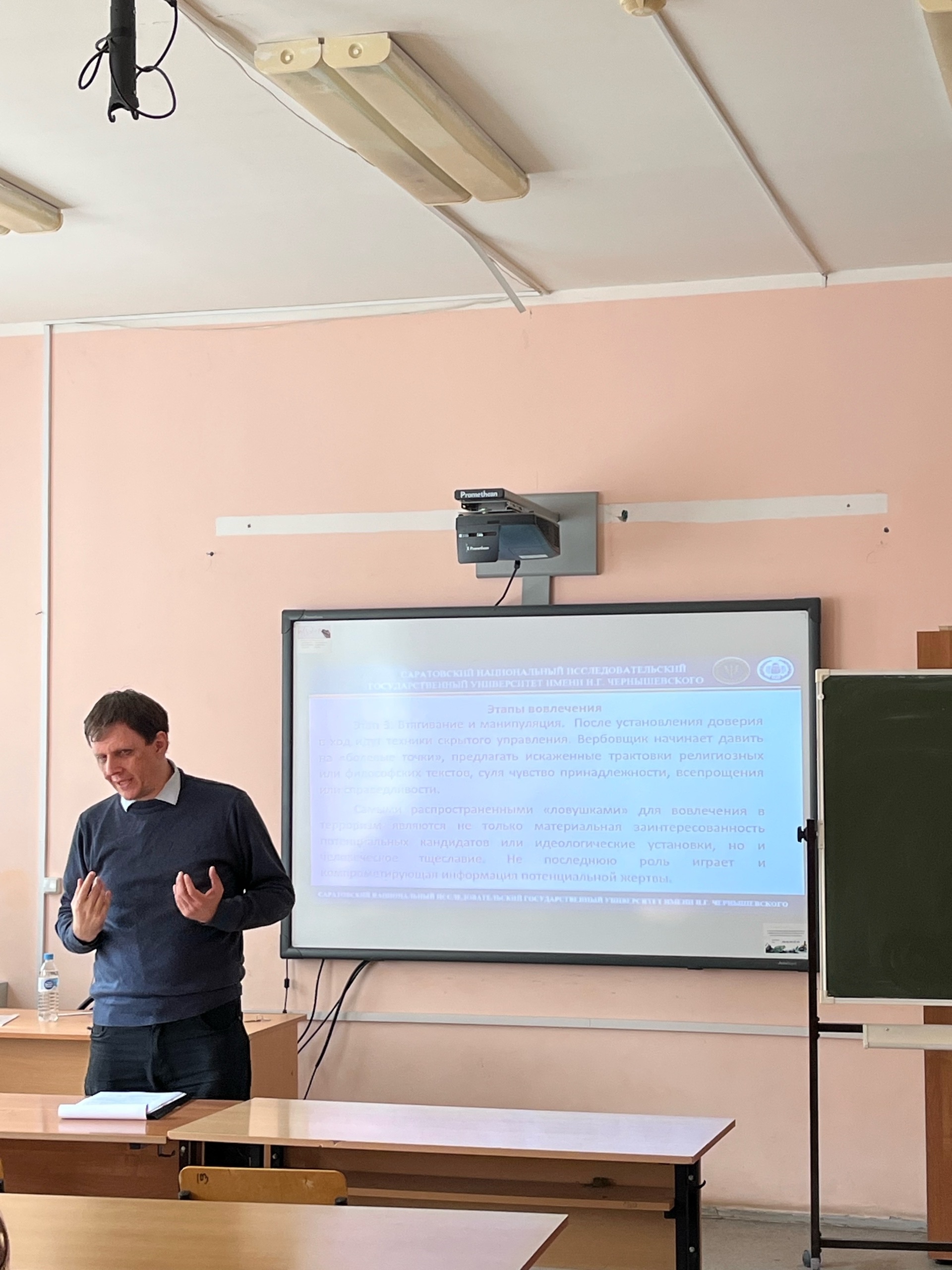 10 октября 2025 г. в рамках кураторского часа психолог лаборатории юридической психологии, ассистент кафедры социальной психологии Киселев Константин Анатольевич провел интерактивный мастер-класс на тему «Профилактика вовлечение в экстремистское поведение. Беседа 1. Виды психологических манипуляций и методы их выявления».