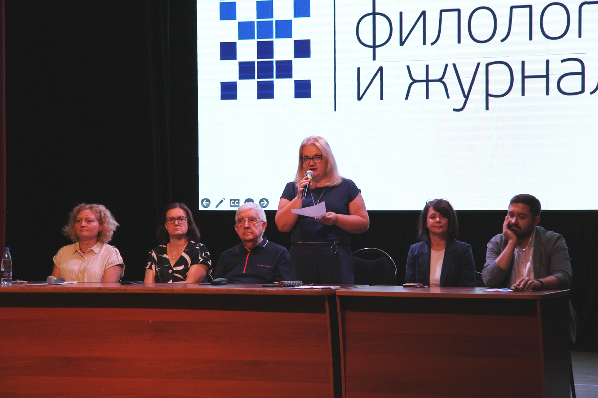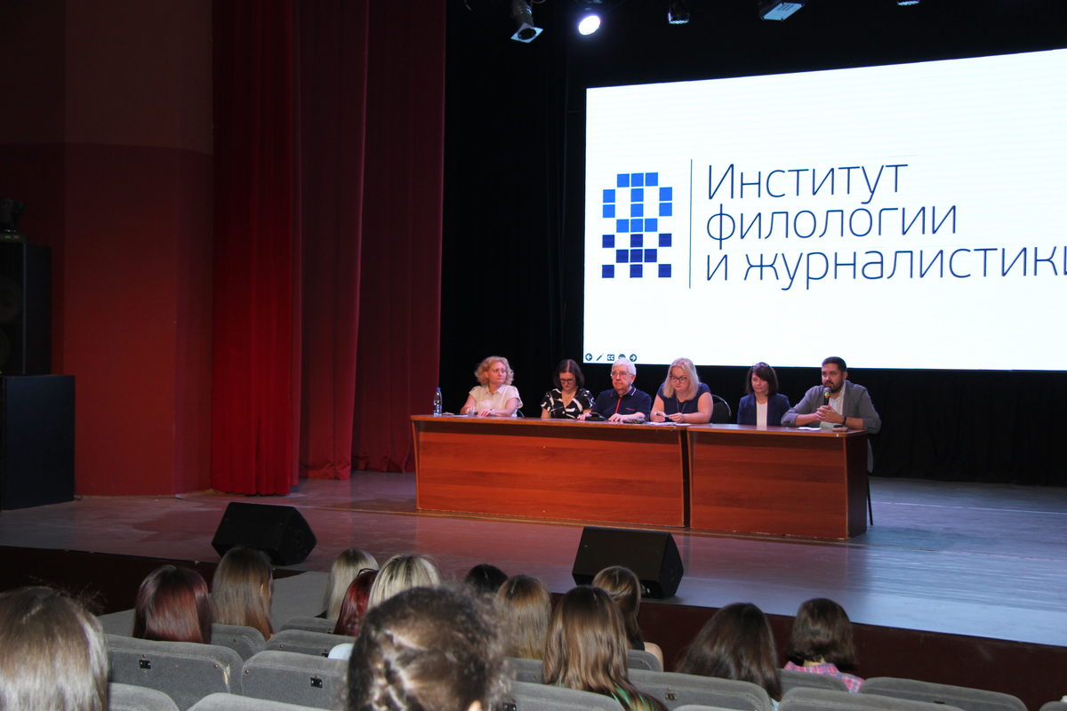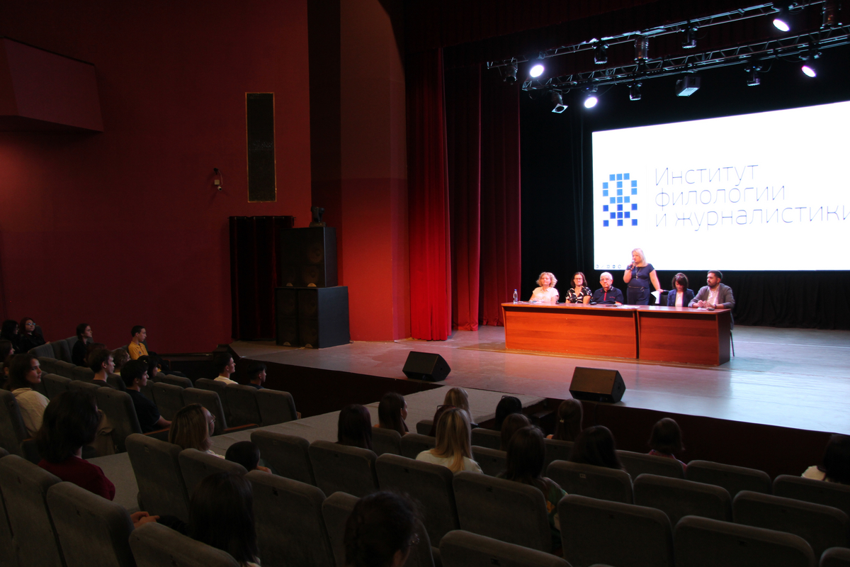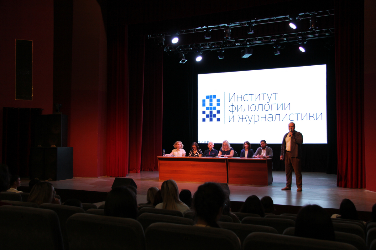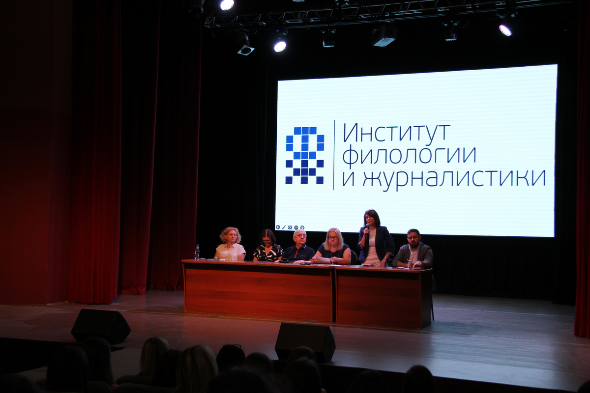 Людмила Сергеевна представила научного руководителя ИФиЖ, заведующего кафедрой общего литературоведения и журналистики В. В. Прозорова, ответственную за социальную работу Г. М. Алтынбаеву, ответственную за научную работу И. В. Бибину, ответственного за воспитательную работу и связи с общественностью Р. И. Павленко, заведующую кафедрой романо-германской филологии и переводоведения Т. В. Харламову.