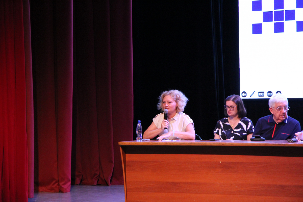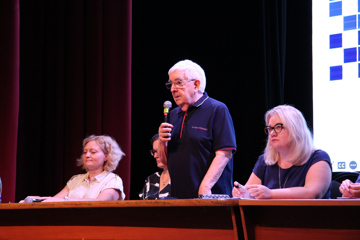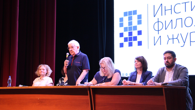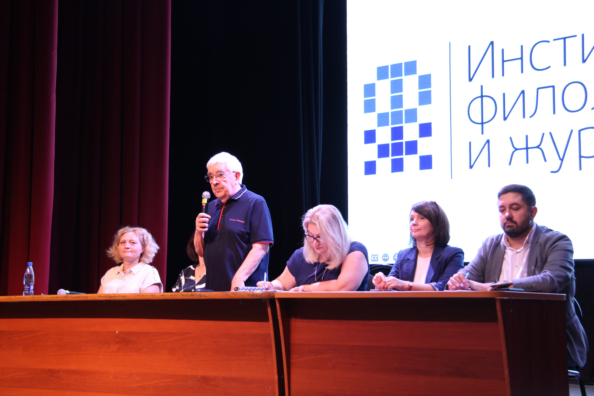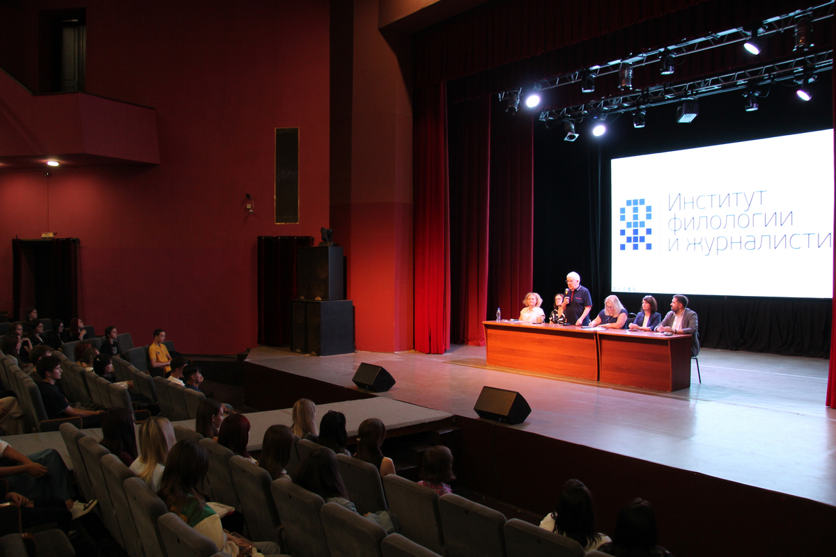 Людмила Сергеевна представила научного руководителя ИФиЖ, заведующего кафедрой общего литературоведения и журналистики В. В. Прозорова, ответственную за социальную работу Г. М. Алтынбаеву, ответственную за научную работу И. В. Бибину, ответственного за воспитательную работу и связи с общественностью Р. И. Павленко, заведующую кафедрой романо-германской филологии и переводоведения Т. В. Харламову.