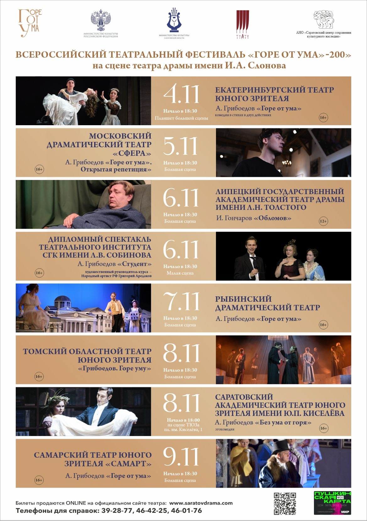 «Горе от ума – 200» предлагает саратовскому зрителю возможность увидеть это бессмертное произведение на сцене Саратовского государственного академического театра драмы им. И. А. Слонова в самых разнообразных интерпретациях, а именно:
