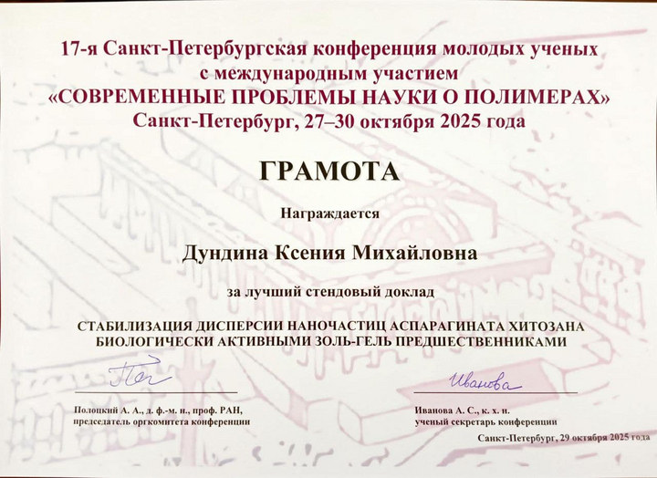 Работа «Стабилизация дисперсии наночастиц аспарагината хитозана биологически активными золь-гель предшественниками» аспирантки Института химии Дундиной Ксении Михайловны (научный руководитель Шиповская А.Б.) оценена грамотой за лучший стендовый доклад в секции «Биополимеры и полимеры медицинского назначения».