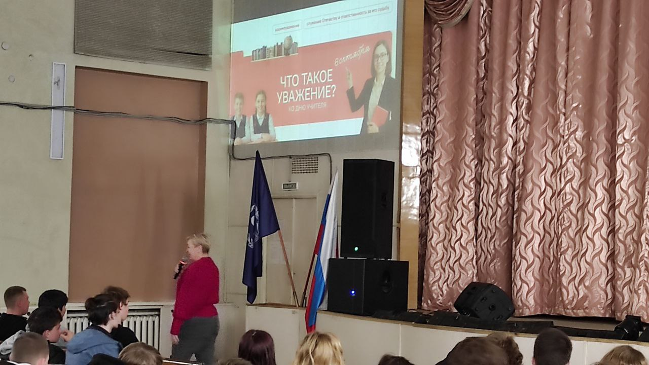 7 октября 2025 года в Большом актовом зале Колледжа радиоэлектроники имени П.Н. Яблочкова прошел классный час для студентов 1-2 курсов из цикла мероприятий проекта «Разговоры о важном». Тема классного часа – «Что такое уважение? Ко Дню учителя». Мероприятие провела Советник директора по воспитанию и взаимодействию с детскими общественными объединениями Поликарпова Светлана Вячеславовна