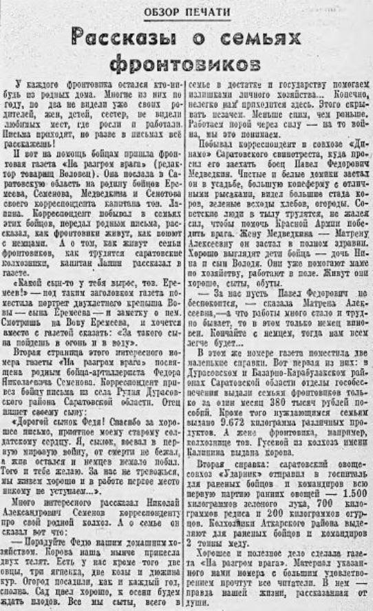 В систематическом обзоре печати стала постоянной рубрика «Рассказы о семьях фронтовиков». У каждого фронтовика остались дома родные. В письмах всего не расскажешь и фронтовая газета «На разгром врага» послала в Саратовскую область на родину бойцов Еремеева, Семенова, Медведкина и Сенотова своего корреспондента капитана тов. Лапина. Корреспондент побывал в семьях этих бойцов, передал родным письма, рассказал, как фронтовики живут, как воюют с немцами. А о том, как живут семьи фронтовиков, как трудятся саратовские колхозники, капитан Лапин рассказал в газете. Об этом написала "Красная звезда" 29 июня 1943 г.