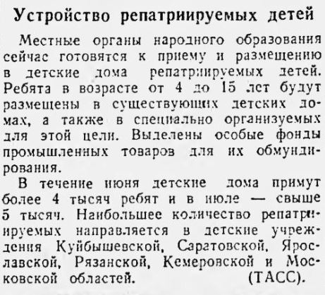 Также местные органы народного образования сейчас готовятся к приему и размещению в детские дома репатриируемых детей. Ребята в возрасте от 4 до 15 лет будут размещены в существующих детских домах и в специально организуемых для этой цели. Выделены особые фонды промышленных товаров для их обмундирования, сообщает корреспондент газеты "Красная звезда" 28 июня 1945 г. [15].