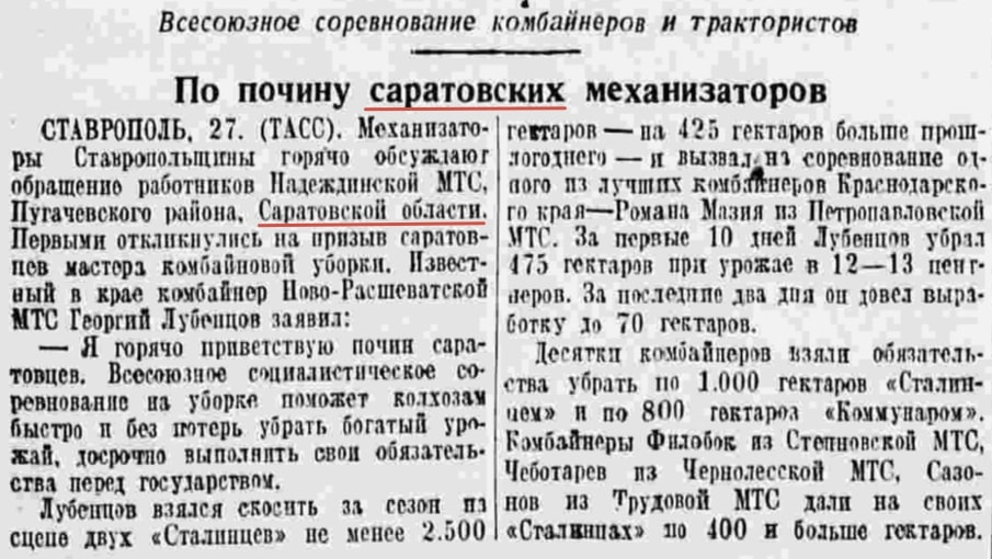 28 июля в газете «Правда» (№ 179 (9950)) в публикации «Всесоюзное соревнование комбайнёров и трактористов. По почину саратовских механизаторов» повествуется о том, что «<...>Механизаторы Ставропольщины горячо обсуждают обращение работников Надеждинской МТС, Пугачёвского района, Саратовской области», поддерживают их начинания и, в рамках Всесоюзного социалистического соревнования, берут на себя новые дополнительные обязательства по уборке урожая. [26]
