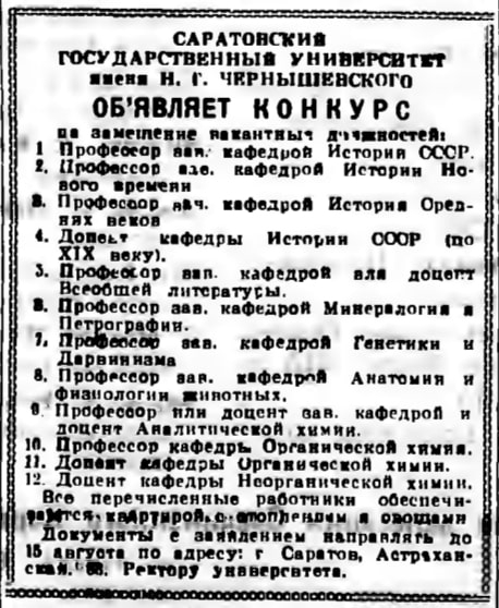 3 августа в газете «Известия» (№ 181 (8791)) в небольшой, но информативной заметке «Саратовский Государственный Университет имени Н.Г. Чернышевского объявляет конкурс на замещение вакантных должностей» публикуется список из 12 вакантных должностей. «<...>Все перечисленные работники обеспечиваются квартирой с отоплением и овощами. Документы с заявлением направлять до 15 августа…». [ 41 ]