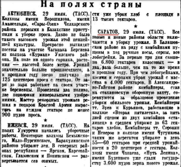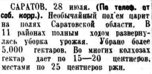 29 июля в газете «Известия» (№ 177 (7553)) в заметке «Дружная работа на полях» корреспондент описывает необычайный подъём в уборке урожая на полях саратовских колхозов, в результате которого собрано уже более 5.000 гектаров, по 15-20, местами по 25 центнеров с гектара. [ 2 ]