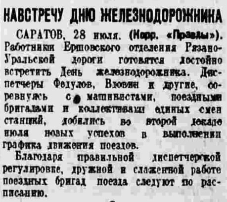 Корреспондент газеты «Правда» в номере от 29 июля в публикации «Навстречу Дню железнодорожника» рассказывает о приуроченных к празднованию Дня железнодорожника соревнованиях среди машинистов поездных бригад, диспетчеров и коллективов единых смен станций Ершовского отделения Рязано-Уральской дороги. [ 5 ]